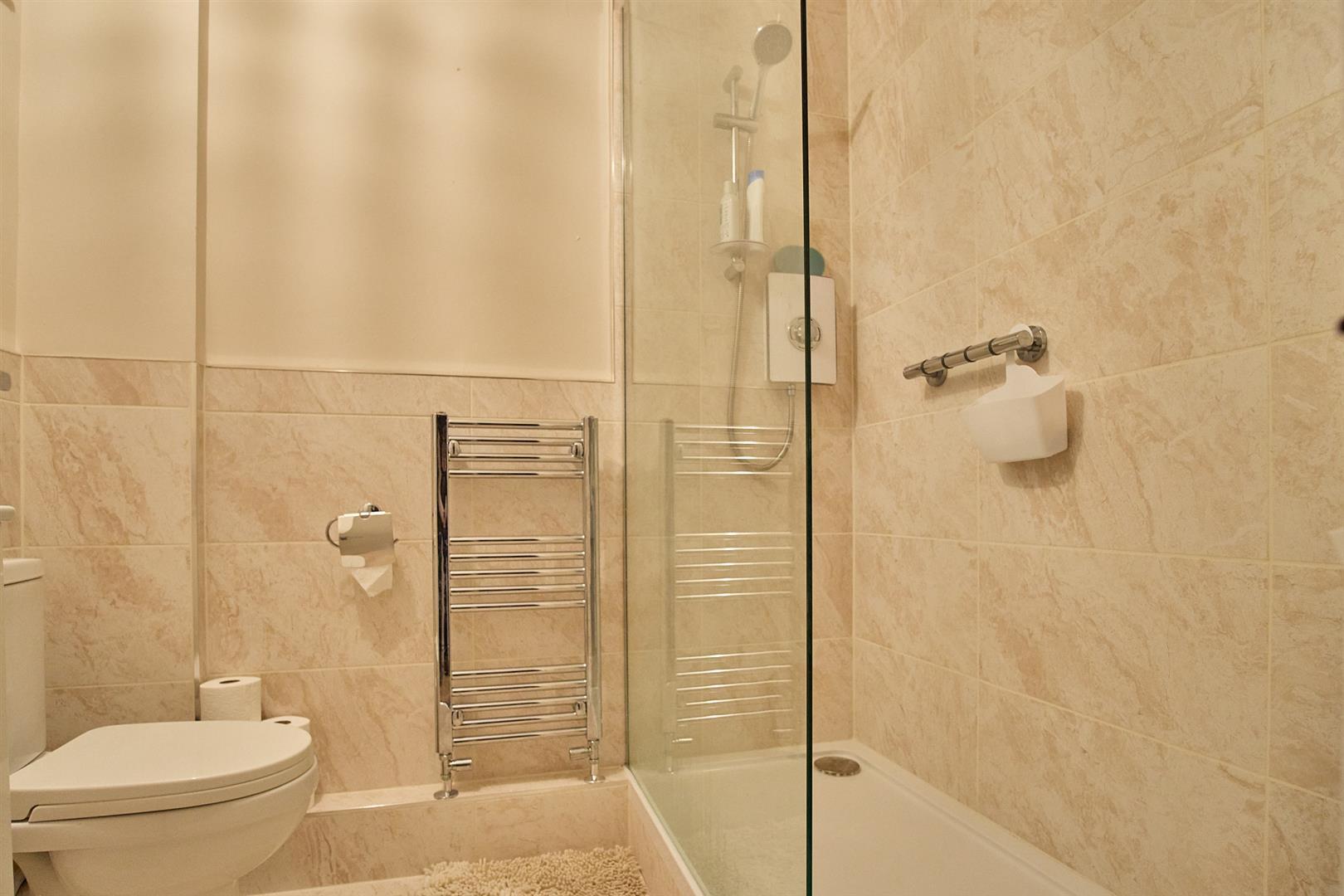 With tiled flooring, three piece suite consisting of vanity wash hand basin with storage beneath, chrome mixer tap, low level WC. Shower tray with shower screen, wall mounted electric shower, chrome towel heater, tiled surrounds. Door to