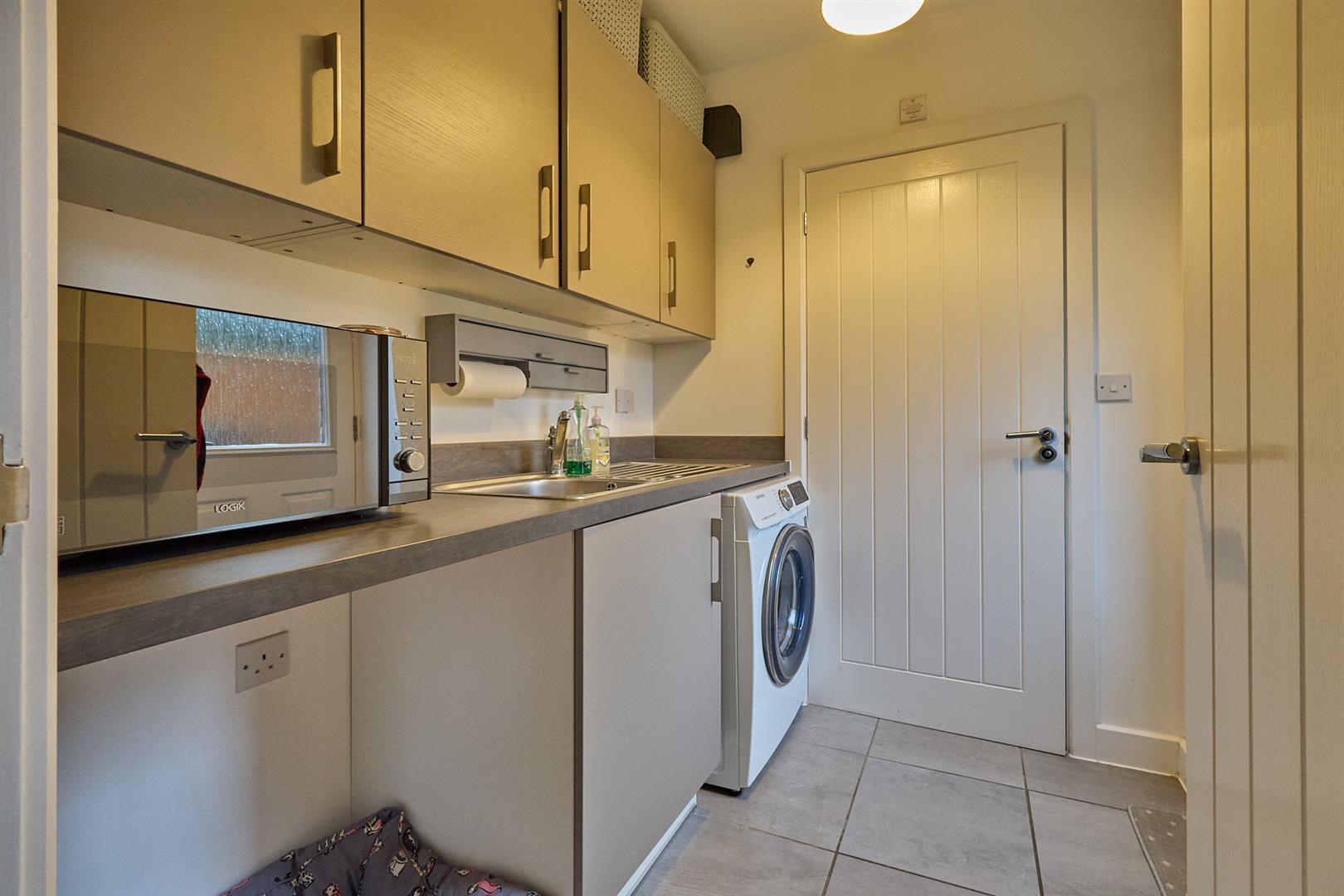 With matching units from the kitchen consisting inset single drainer stainless steel sink unit, mixer tap above single cupboard beneath. Grey working surfaces above, matching upstands, further matching range of wall mounted cupboard units, appliance recess points and plumbing for automatic washing machine. Light grey ceramic tiled flooring, radiator. White composite panel and double glazed door leading to the rear garden. Door to