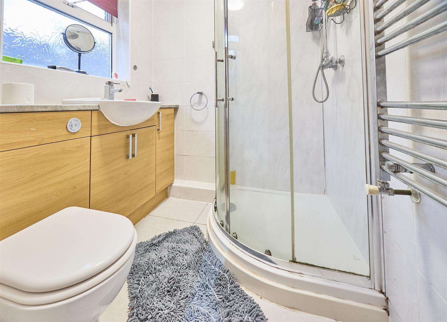 With white suite consisting of a shower cubicle with glazed shower doors. Vanity sink with light over and double cupboard beneath, low level WC, contrasting fully tiled surrounds including the flooring, chrome heated towel rail, extractor fan.