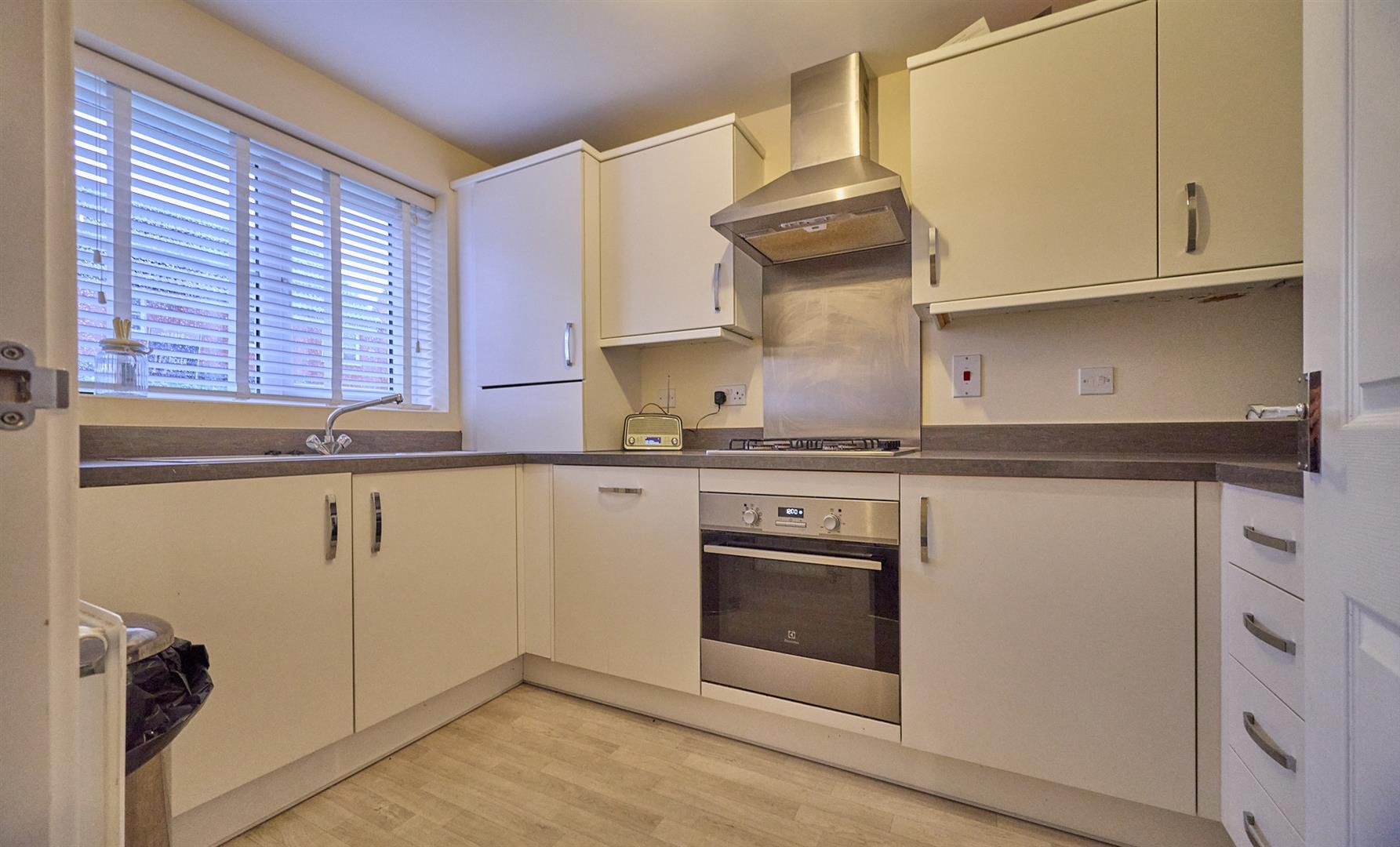 With panel door, wood effect vinyl flooring, single panel radiator, a range of cream wood grain floor standing kitchen cupboard units with chrome handles. Wood effect working surfaces, one and a half stainless steel sink with chrome mixer tap. Built in Electrolux oven, four ring gas hob, extractor fan above. Built in fridge freezer, further matching range of wall cupboard units one housing the logic combination boiler for domestic hot water and gas central heating. Panel door to