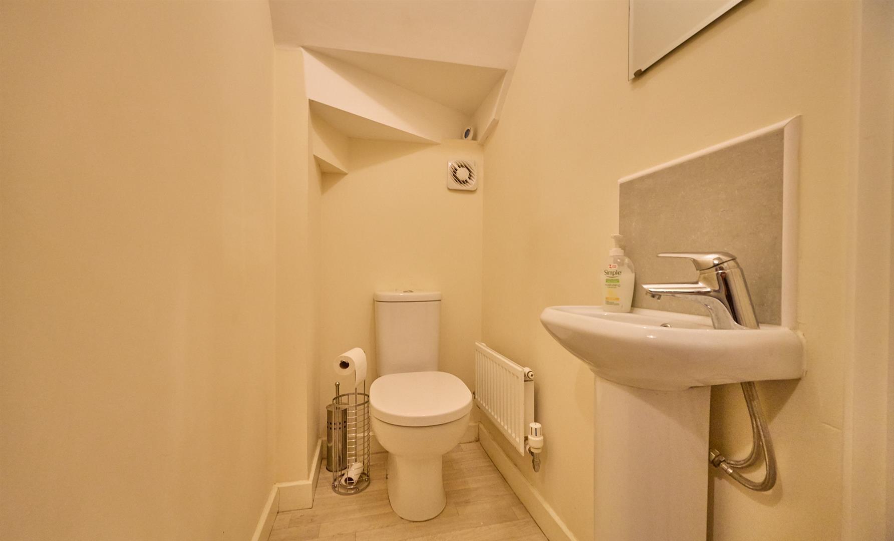 With low level WC, pedestal wash hand basin, tiled splashback, extractor fan.