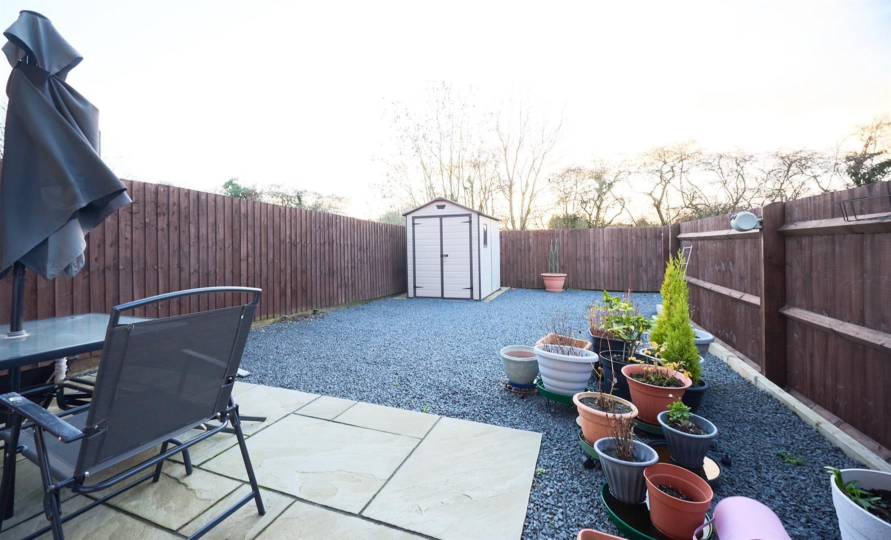 The property situated in a cul de sac set back from the road having a hard landscaped decorative stone front garden, there is a long tarmacadam driveway leading down the side of the property offering ample car parking and a garage space (STPP). A timber gate offers access to the fully fenced and enclosed rear garden which has a sunny aspect, hard landscaped having a Indian stone patio adjacent to the rear of the property beyond which the garden is grey decorative stones. There is also a tap and security light. There is also a plastic shed and the property overlooks allotments to rear.