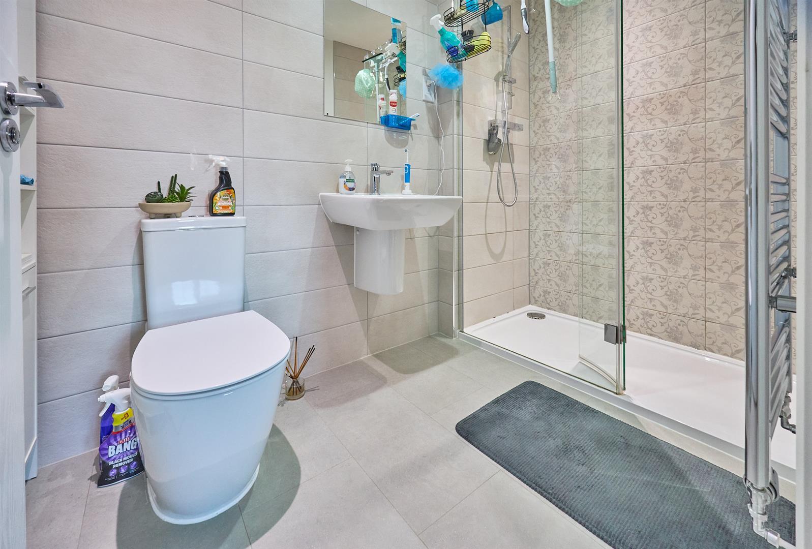 With white suite consisting of a fully tiled double shower cubicle with glazed shower door, pedestal wash hand basin and low level WC, contrasting tiled surrounds. Chrome heated towel rail and inset ceiling spotlights, extractor fan and shaver point.