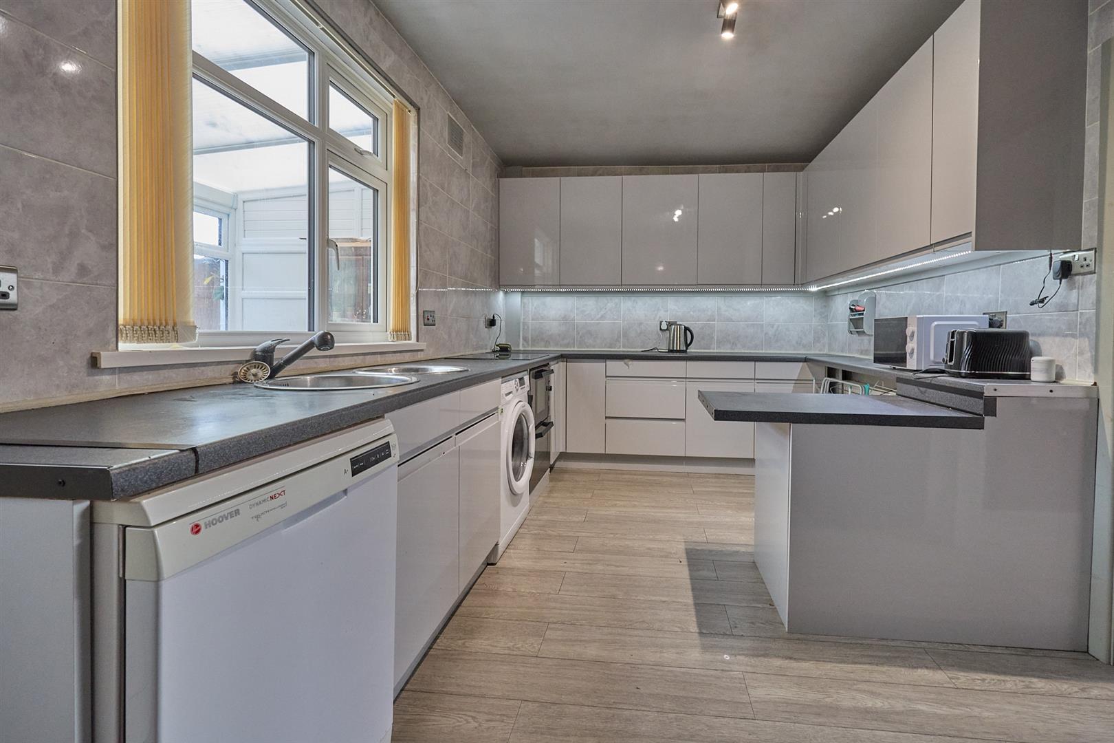 With a fashionable range of gloss light grey fitted kitchen units with soft close doors consisting inset circular stainless steel sink unit and matching drainer, mixer tap above, double base unit beneath. Further matching range of floor mounted cupboard units and three drawer unit, contrasting dark grey roll edge working surfaces above with inset four ring ceramic hob unit, double fan assisted oven with grill beneath, tiled splashbacks. Further matching wall mounted cupboard units. Appliance recess points and plumbing for automatic washing machine and dishwasher. Concealed lighting over the working surfaces. Power points and light switches are all in chrome. Radiator, grey wood grain laminate wood strip flooring. Floor to ceiling broom cupboard. UPVC SUDG door leads to the UPVC SUDG conservatory.