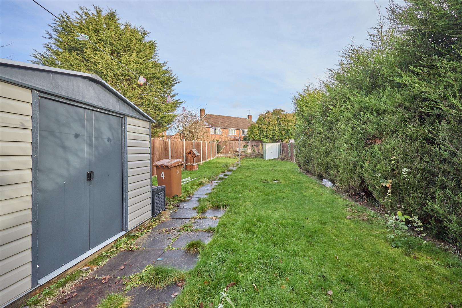 The property is set back from the road having a full width block paved driveway to front, a decorative stone pathway and timber gate lead down the side of the property to the long rear garden which is enclosed by panelled fencing and mature hedging, having a full width block paved patio adjacent to the rear of the property where there is an outside tap, edged by a low brick retaining wall, beyond which the garden is principally laid to lawn. There is also a plastic and metal shed included.