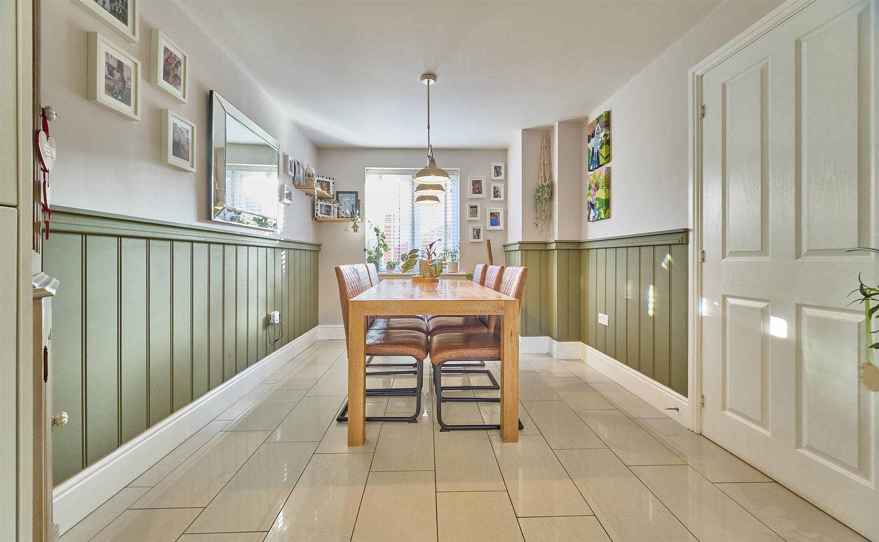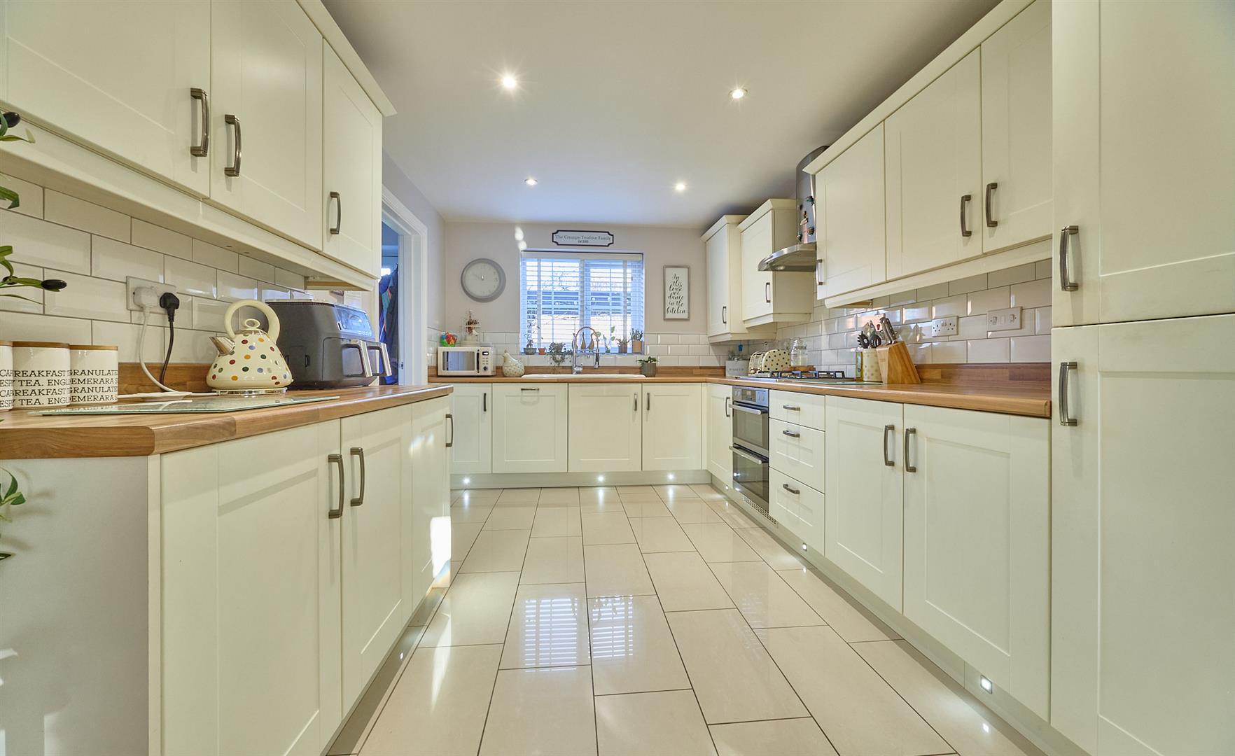 Dining area to front with porcelain tiled flooring, double panel radiator, TV aerial point. Kitchen area to rear, with a range of matte cream fitted kitchen units with soft close doors consisting inset one and a half bowls, single drainage stainless steel sink unit, mixer taps above, double base unit beneath. Further matching range of floor mounted cupboard units and three drawer unit. Contrasting walnut finish roll edge working surfaces above with inset four ring stainless steel gas hob unit. Double fan assisted oven with grill beneath. Stainless steel splashback and stainless steel chimney extractor above, matching up stands. Further matching wall mounted cupboard units, one conceals the gas condensing combination boiler for central heating and domestic hot water. Further integrated appliances include a dishwasher, fridge freezer. Inset ceiling spotlights. LED lighting.