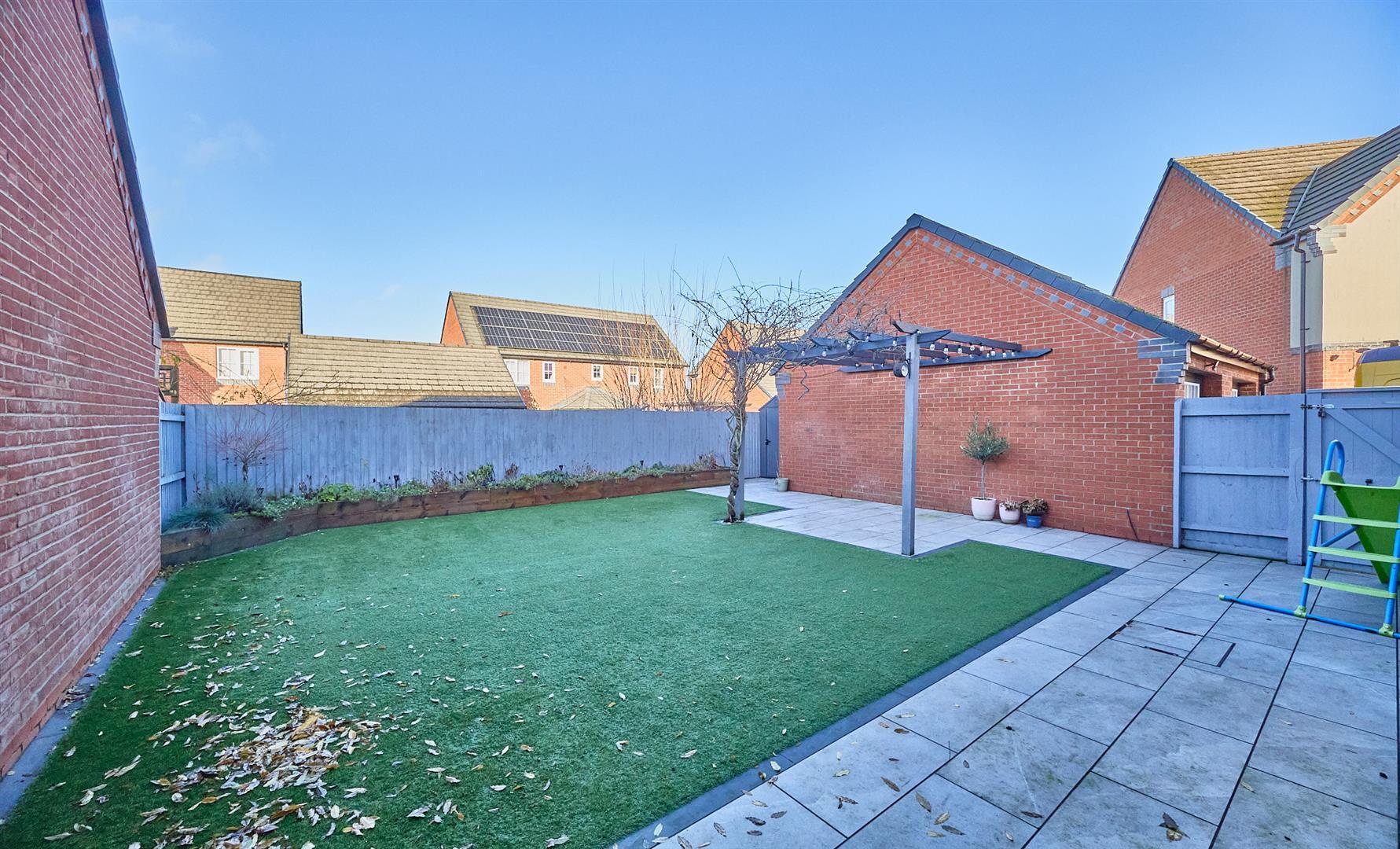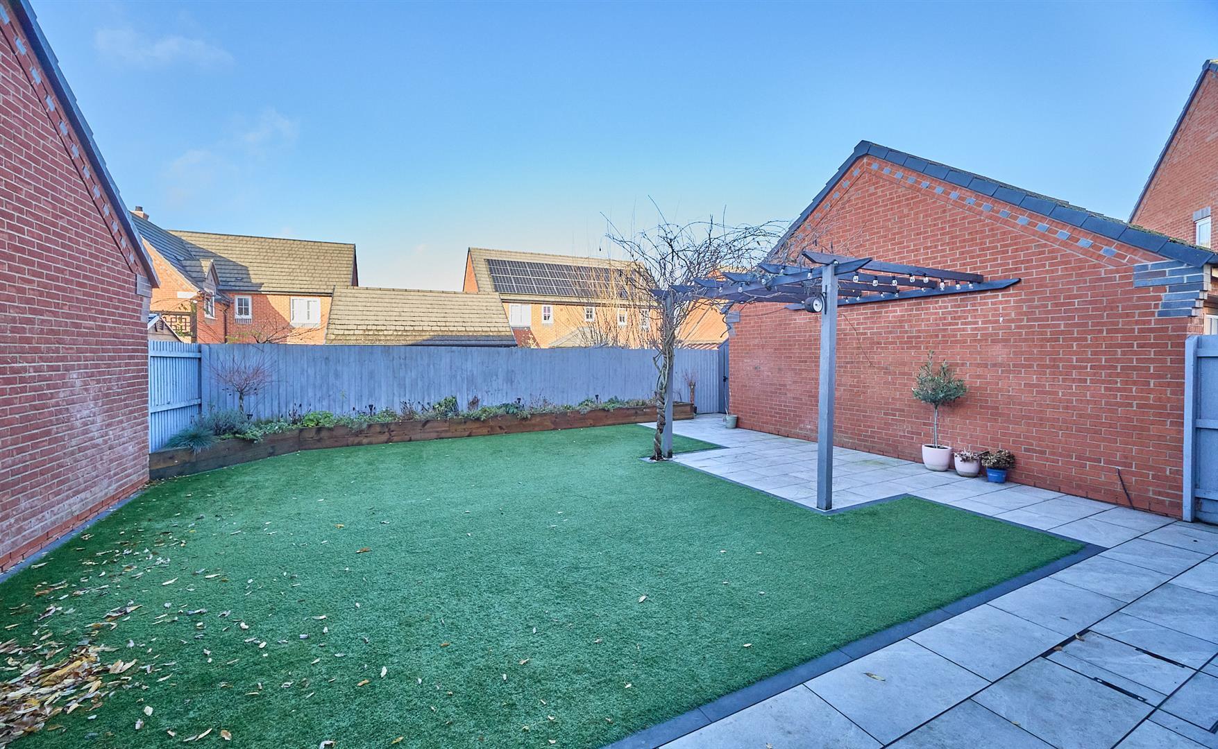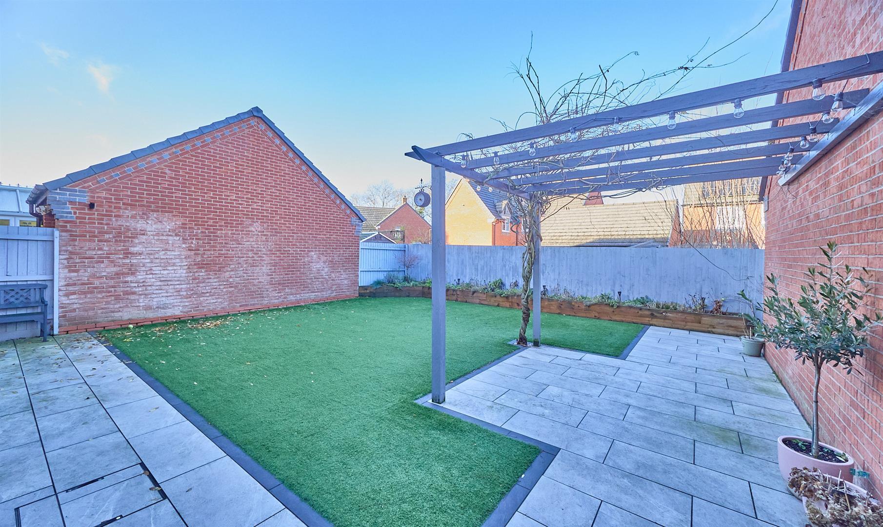 The property is set back from the road. The front garden is landscaped in slate chippings and shrubs. Tarmacadam driveway leads down the side of the property offering ample car parking to single brick build garage with up and over door to front. There is a pitch roof offering further storage, light and power. Timber gate offers access to the fully fenced and enclosed rear garden which has a full width slabbed patio adjacent to the rear of the property where there is an outside tap and light. Beyond which the garden is principally laid to lawn with surrounding well stocked beds and border. Further slabbed patio with surrounding pergola.