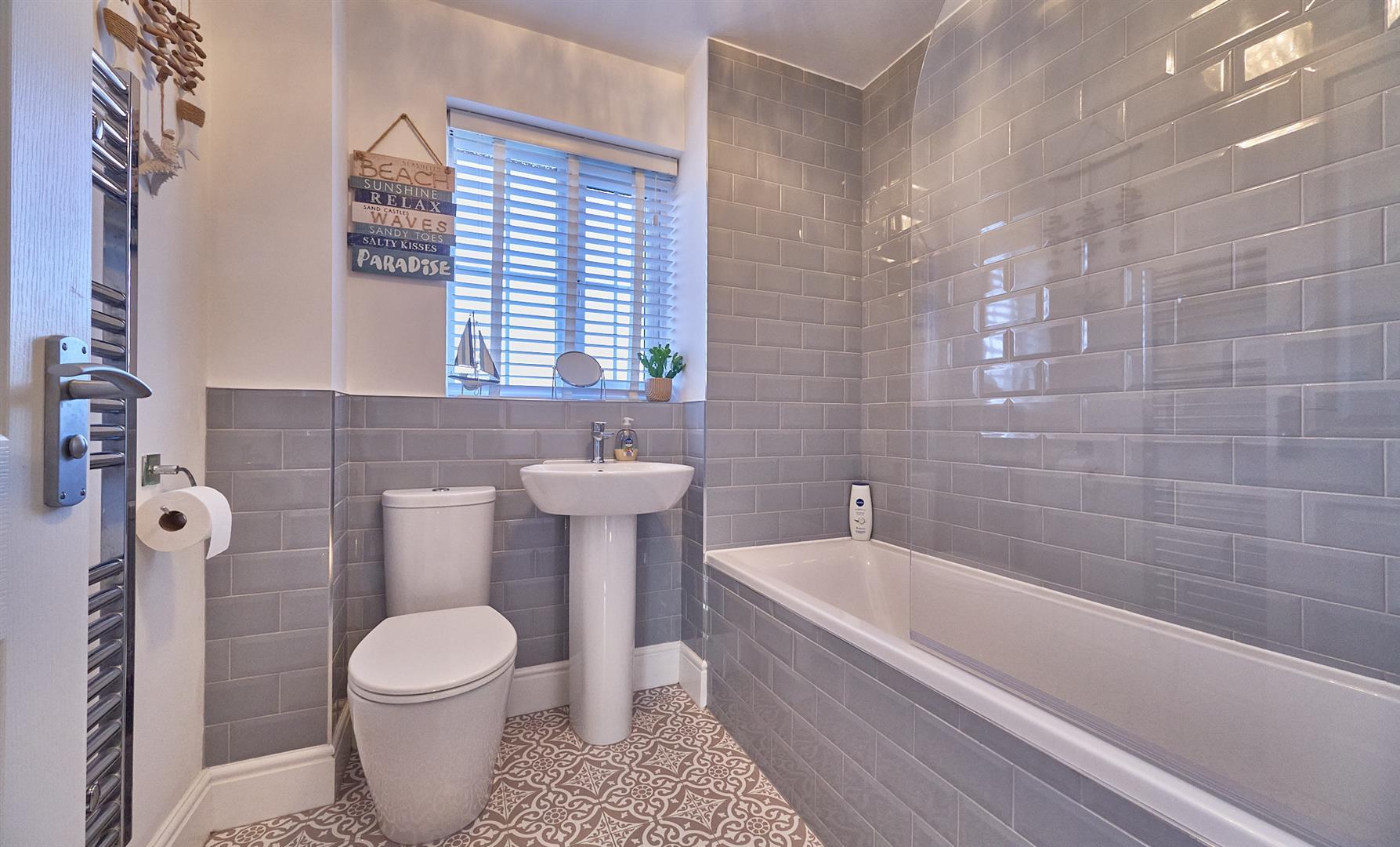 With white suite consisting panelled bath with fully tiled surrounds and mixer shower above. Pedestal wash hand basin. Low level WC, tiled flooring, chrome heated towel rail, extractor fan.