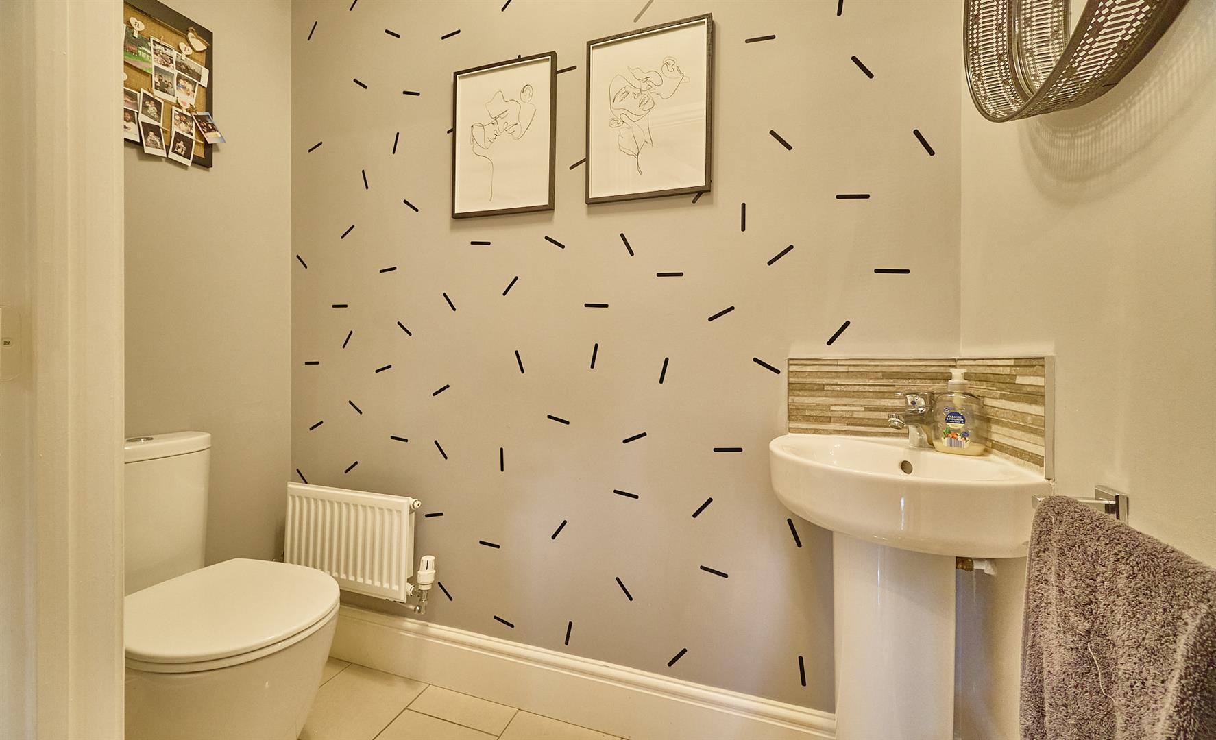 With white suite consisting low level WC, pedestal washing basin, tiled splashbacks, porcelain tiled flooring, radiator, extractor fan.
