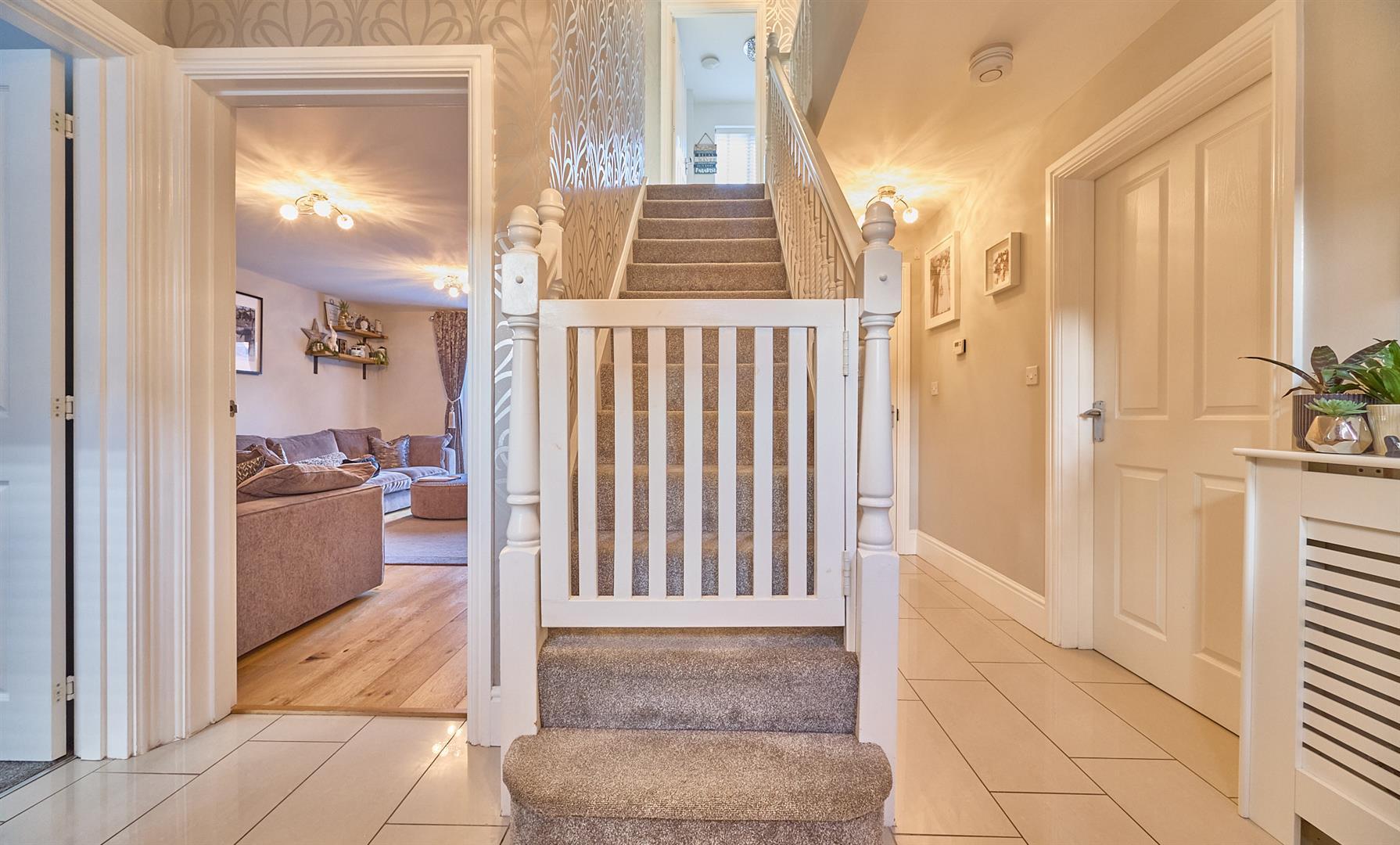With porcelain tiled flooring, radiator, wired in smoke alarm, digital programmer and thermostat for central heating and domestic hot water. Wall mounted consumer unit, wiring for an alarm system, telephone point. Central stairway to first floor with spindle balustrades, useful under stairs storage cupboard beneath. Attractive white four panel interior doors to