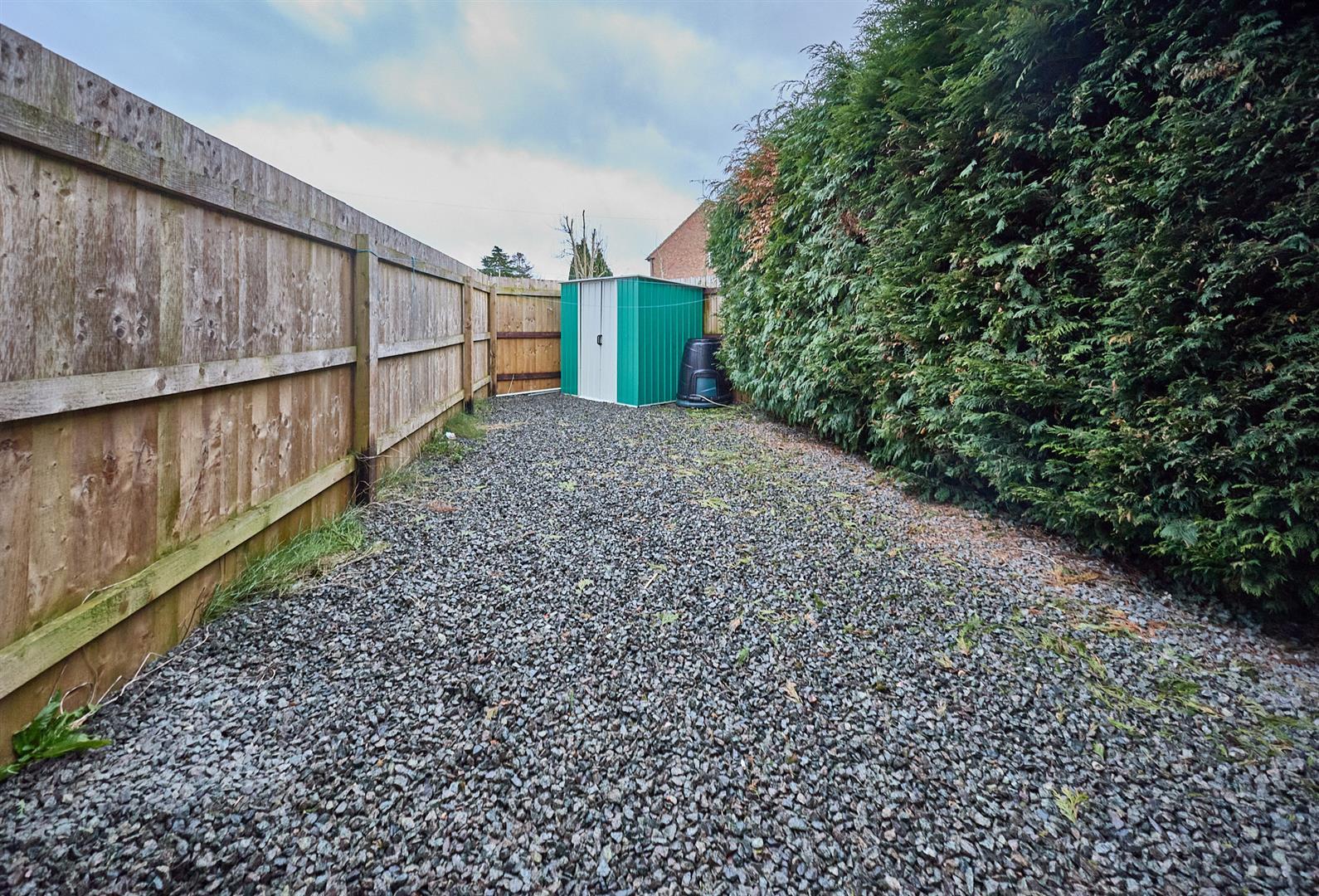 The property is set back from the road with front garden principally laid to lawn. Timber gate offers access to the fully fenced and enclosed rear garden, hard landscaped in decorative stone. Metal shed. The garden has a sunny aspect