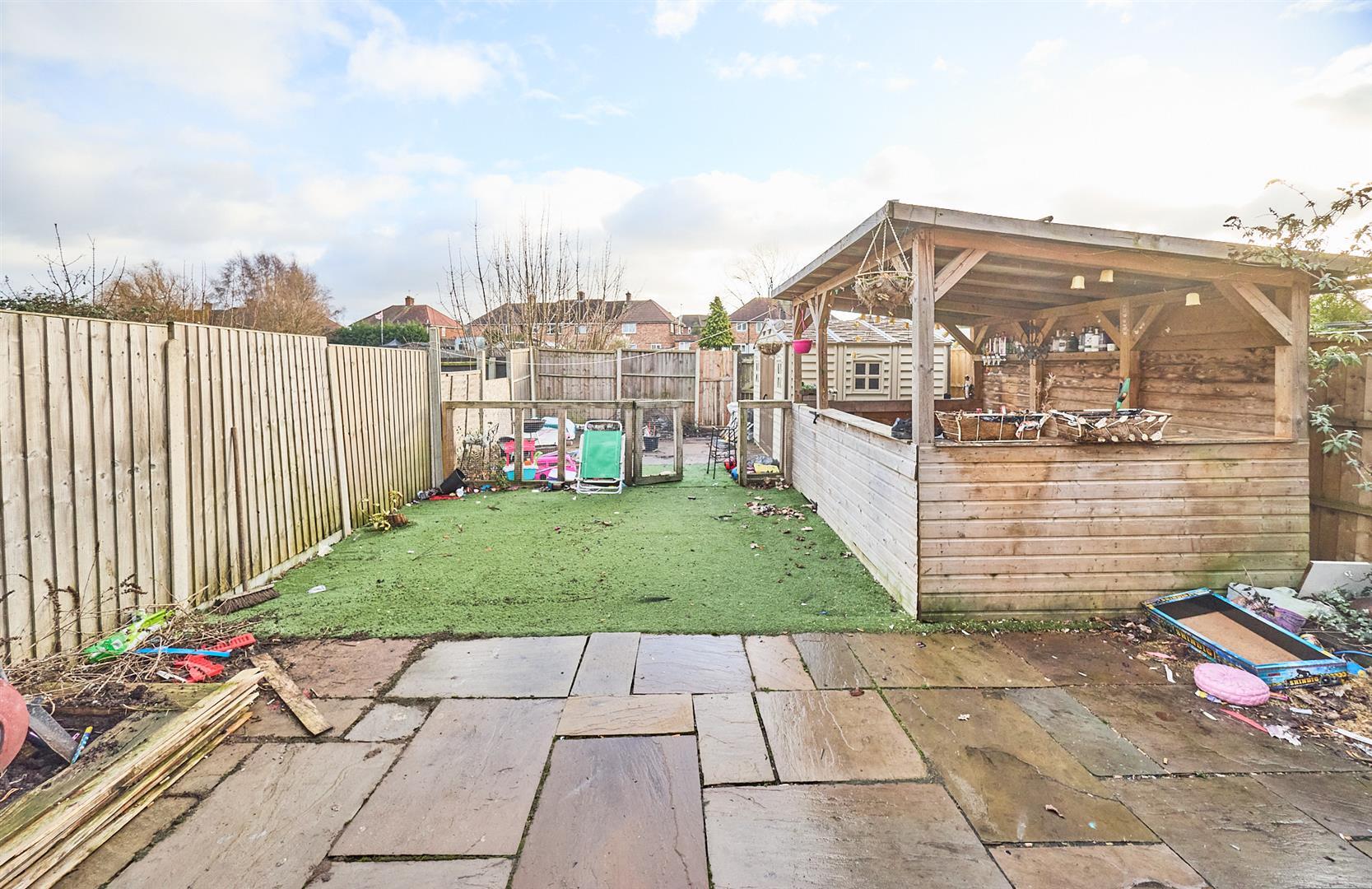 The property is situated in a cul de sac set back from the road, having a full width tarmacadam driveway to front offering ample car parking. There is a good sized fully fenced rear garden, hard landscaped having a full width indian stone patio adjacent to the rear of the property beyond which the garden is astro turfed to the top of the garden. There is a further slabbed patio, outside tap, double power point, the garden has a sunny aspect. There is also a plastic shed. At the bottom of the garden are double timber gates with potential for creating a drive or garage space subject to planning permission.