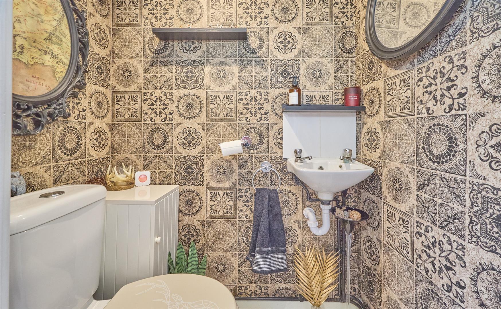 With low level WC, pedestal wash hand basin with tiled splashbacks. Tiled flooring and extractor fan.