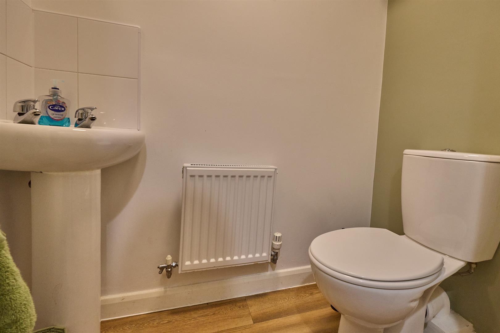 With white suite consisting low level WC, pedestal wash hand basin, tiled splashbacks, wood finish laminate wood strip flooring, radiator, extractor fan.