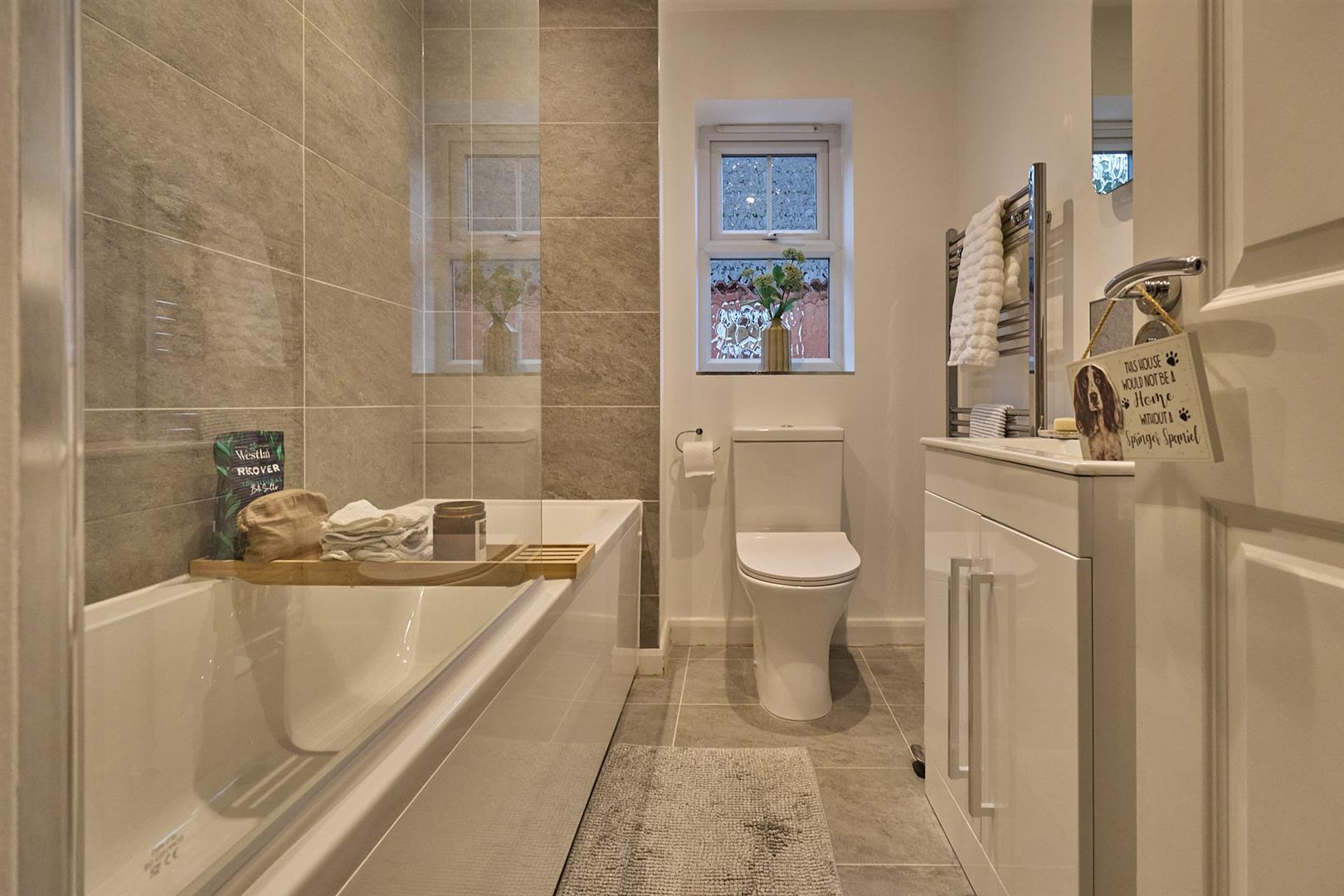 With white suite consisting panel bath with glazed shower screen to side, mains rain shower above, vanity sink unit with gloss white double cupboard beneath, low level WC, contrasting tiled surrounds including the flooring, chrome heated towel rail, extractor fan.