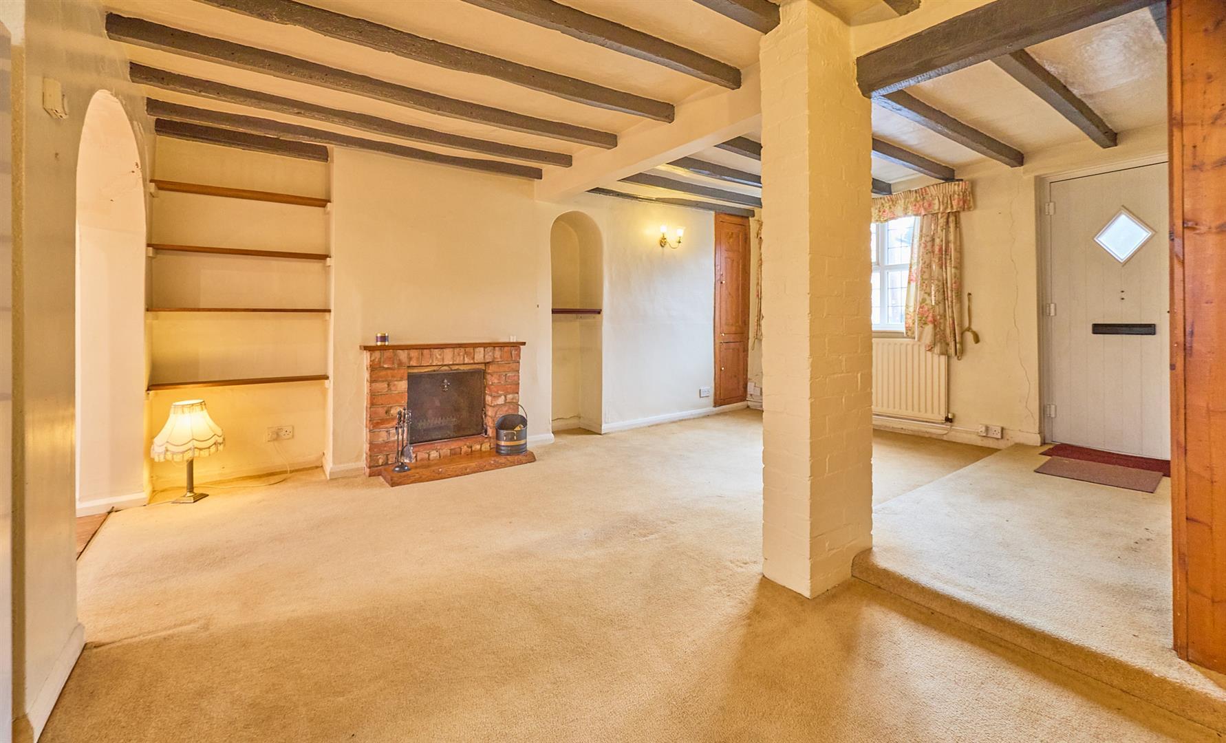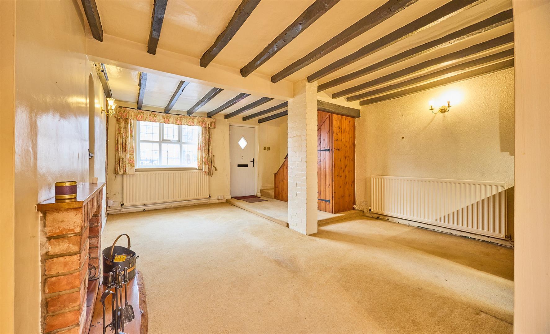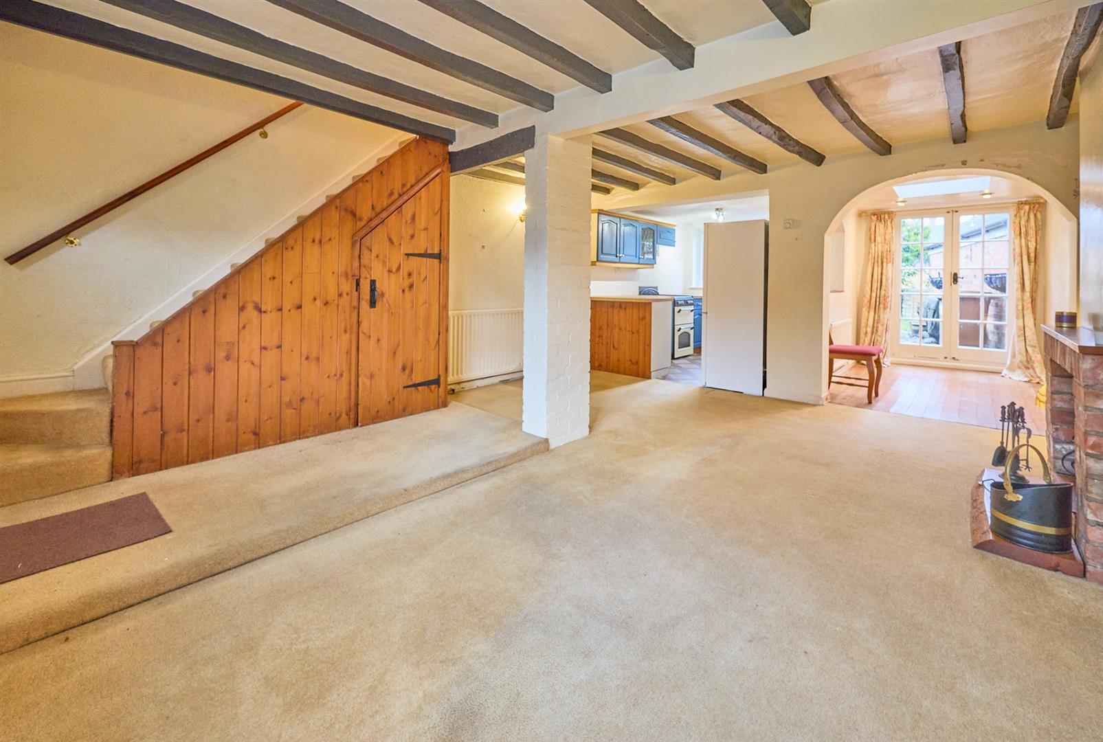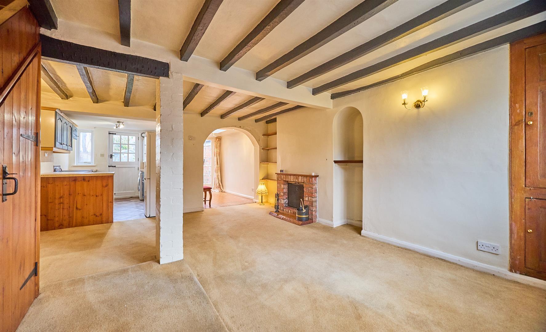 With feature open brick fireplace with raised hearth, alcoves to both sides with fitted display and bookshelf. Two radiators, TV and telephone points, beams to ceiling, built in floor to ceiling original storage cupboards in strip pine housing the meters, thermostat for central heating system, stairway to first floor with useful under stairs storage cupboard beneath. Feature archway leads to
