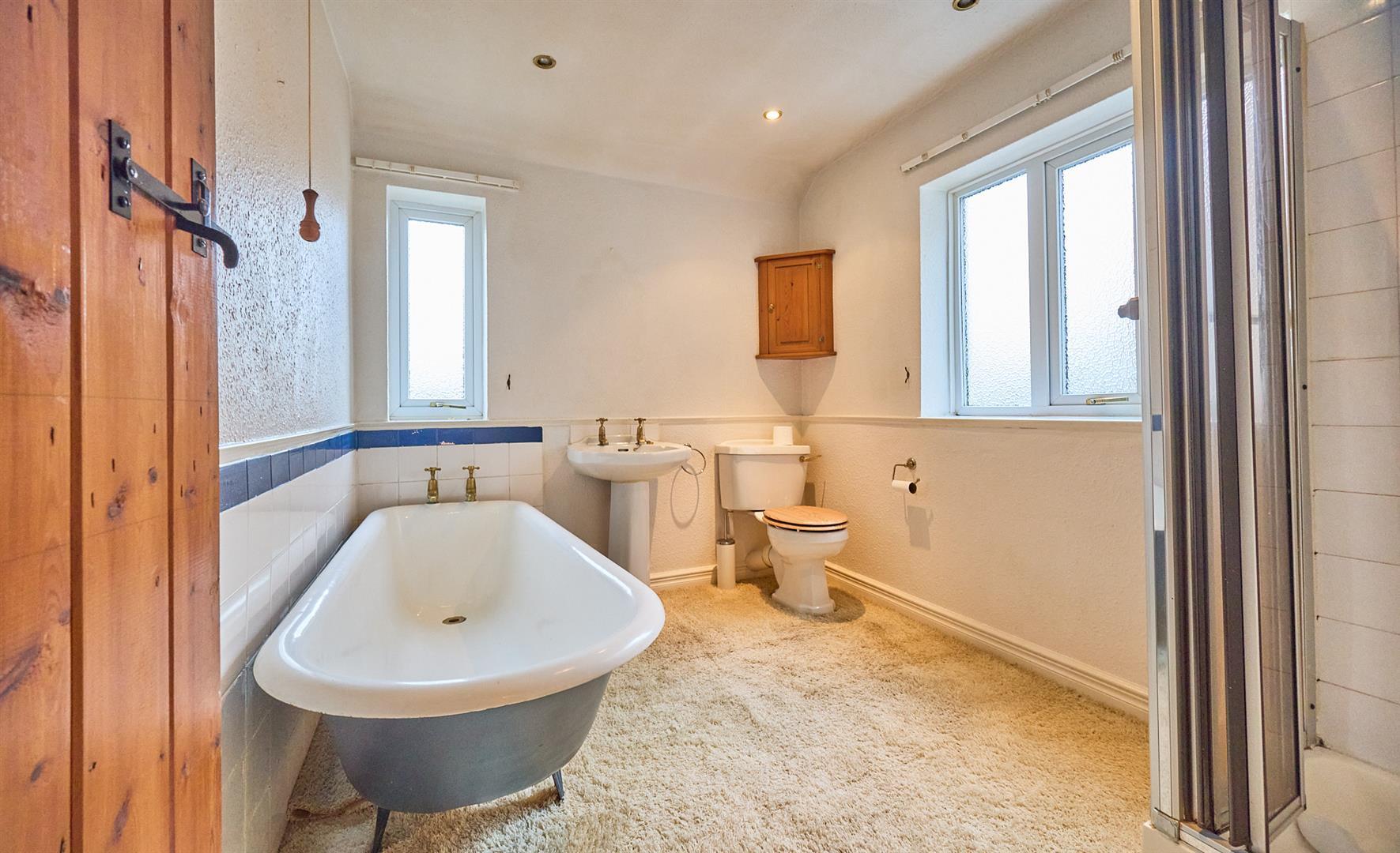 With white suite consisting of a cast iron roll top panel bath with claw feet, pedestal wash hand basin, low level WC, fully tiled shower cubicle with glazed shower door, contrasting tiled surrounds, inset ceiling spotlights, radiator.