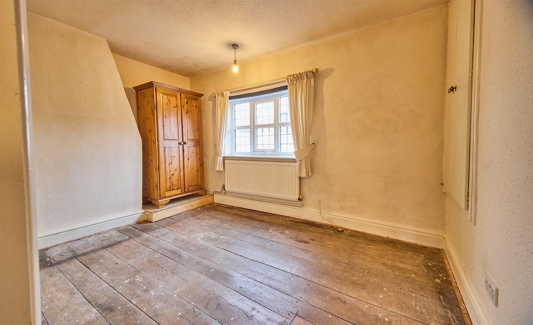 With built in double wardrobe over the stairway, radiator, original stripped flooring.