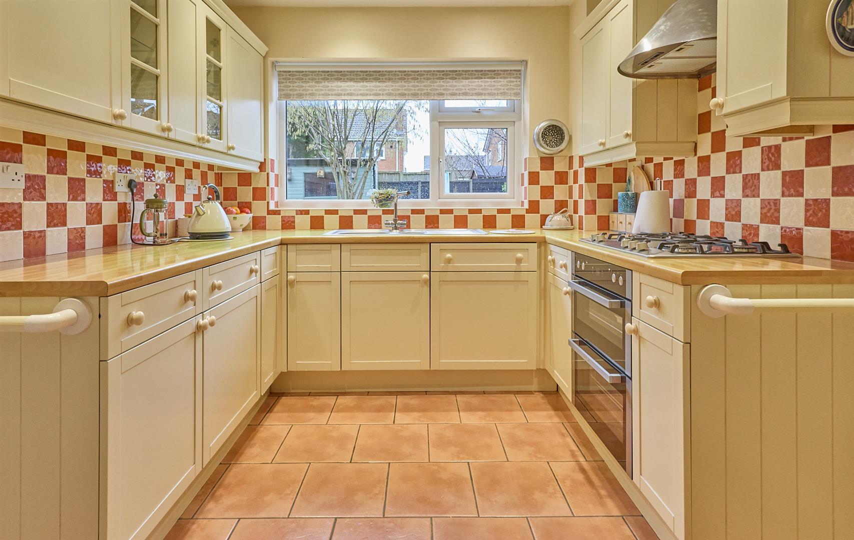 With a range of cream fitted kitchen units consisting inset one and a half bowls, single drainer stainless steel stink, mixer taps above cupboard beneath, further matching floor cupboard units and drawers, contrasting wood grain roll edge working surfaces above with inset five ring stainless steel gas hob unit. Double fan assisted oven with grill beneath, stainless steel chimney extractor above, tiled splashbacks, further matching wall mounted cupboard units including two displays with glazed doors. There is also an integrated dishwasher, ceramic tiled flooring, inset ceiling spotlight, wired in heat detector. There is also a recess for a fridge freezer with a power point, UPVC SUDG door to a rear lobby with a terrazzo tile flooring, UPVC SUDG door to the rear garden. Further white wood panelled glazed door leads to a