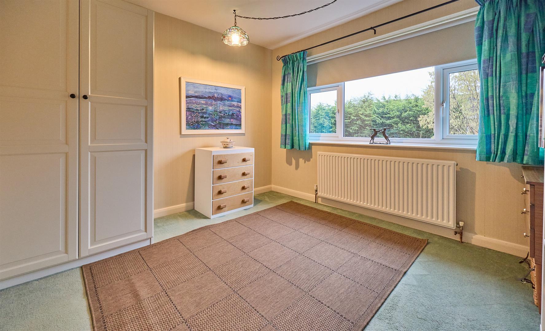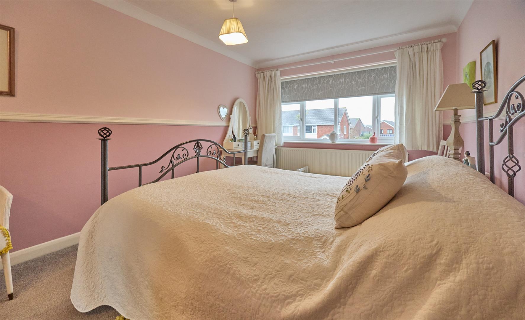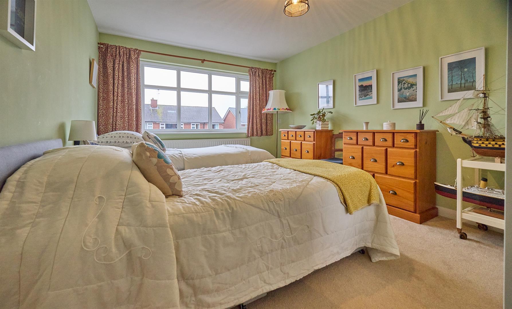 With two built in double slide robes incorporating hanging rails and shelves, door to