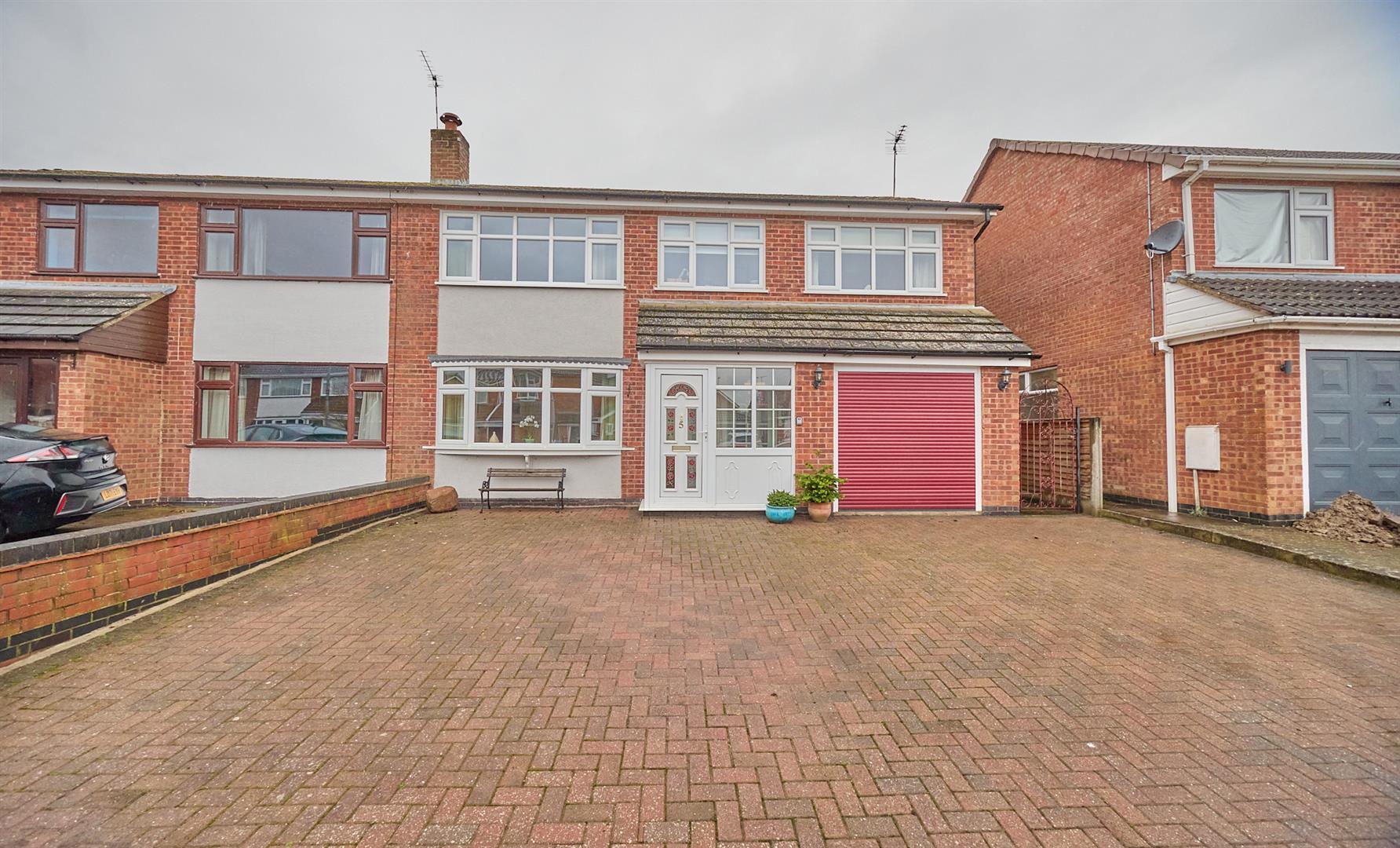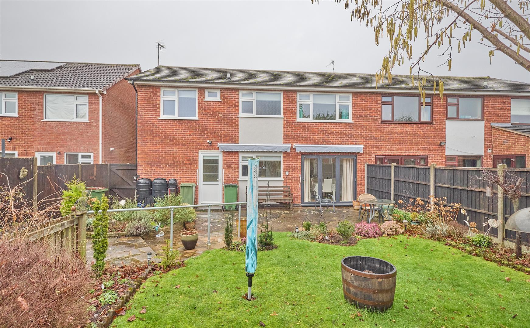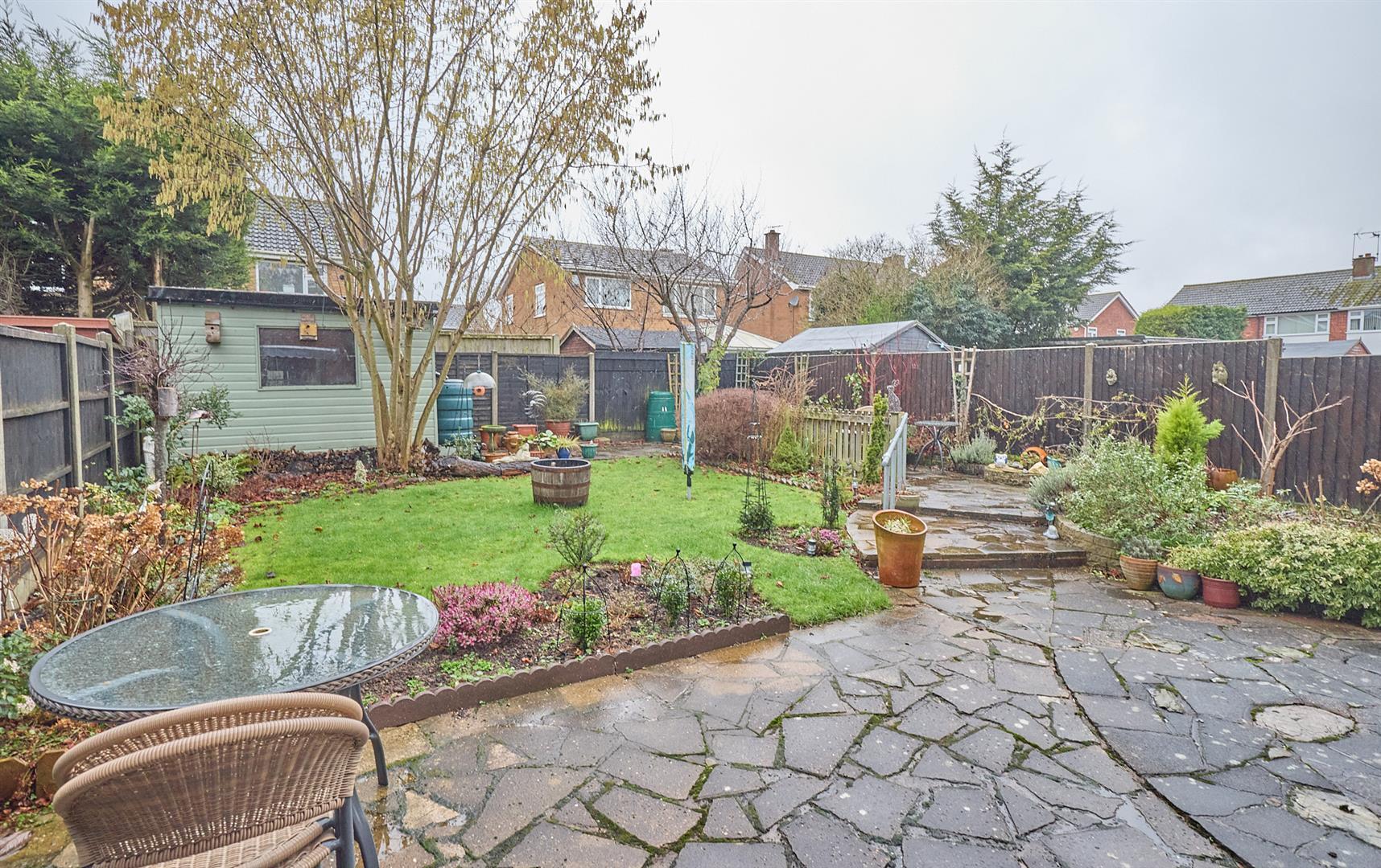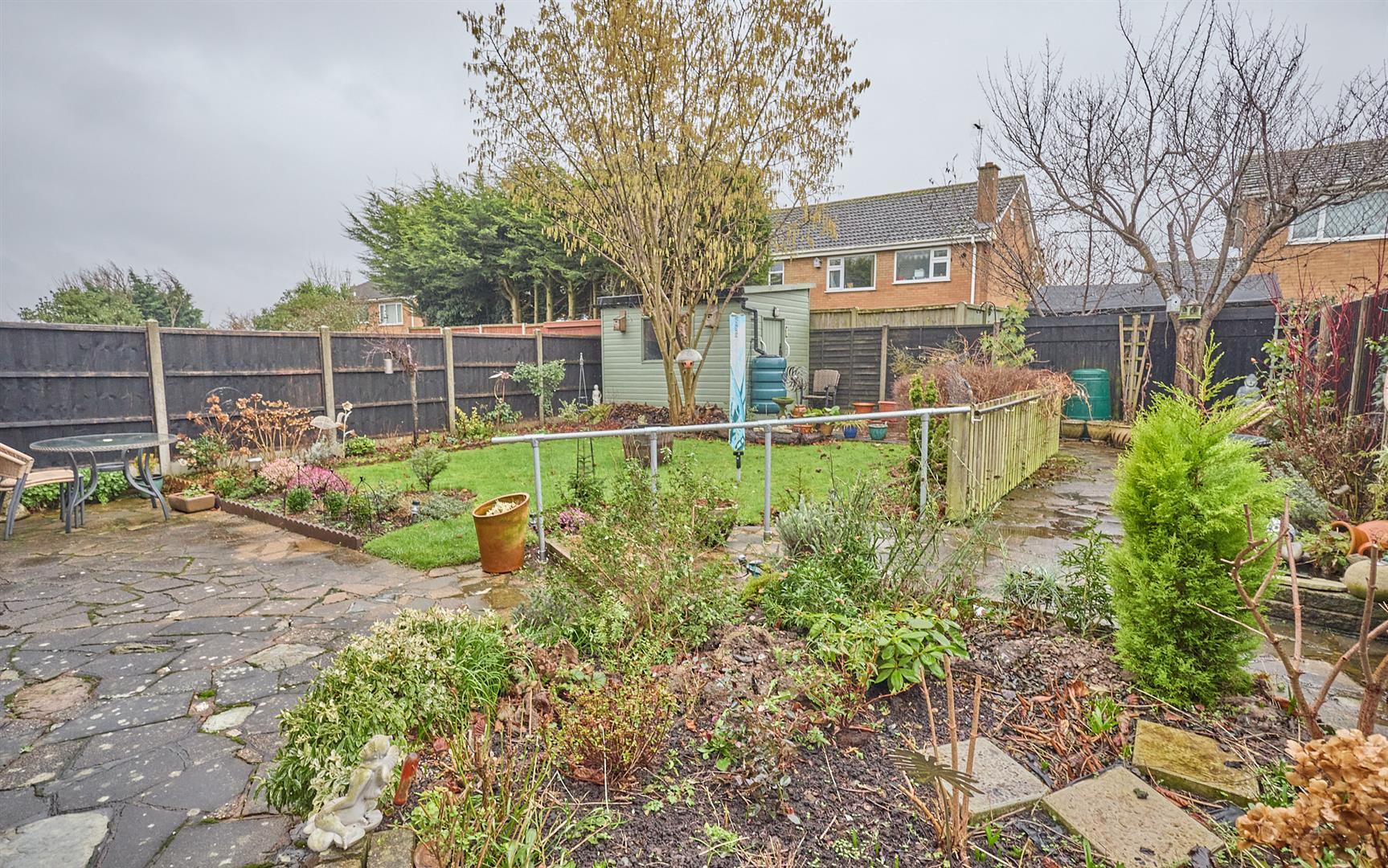 The property is nicely situated in the cul de sac, set back from the road screened behind a brick retaining wall having a full width block paved driveway to front offering ample car parking. The garage (3.03m x 5.58m) with electric shutter door to front, it has light and power, wall mounted consumer units, wall mounted Worcester gas condensing combination boiler for central heating and domestic hot water, UPVC SUDG window to side. A wrought iron gate and timber gate and slab pathway lead down the side of the property to the good sized fully fenced enclosed rear garden which has a full width crazy paved patio adjacent to the rear of the property edged by low brick retaining walls and raised beds. Beyond which the garden is principally laid to lawn with surrounding beds and borders, to the top of the garden is a further L shaped patio and there is a large timber shed with light and power, outside lighting, tap and power point.