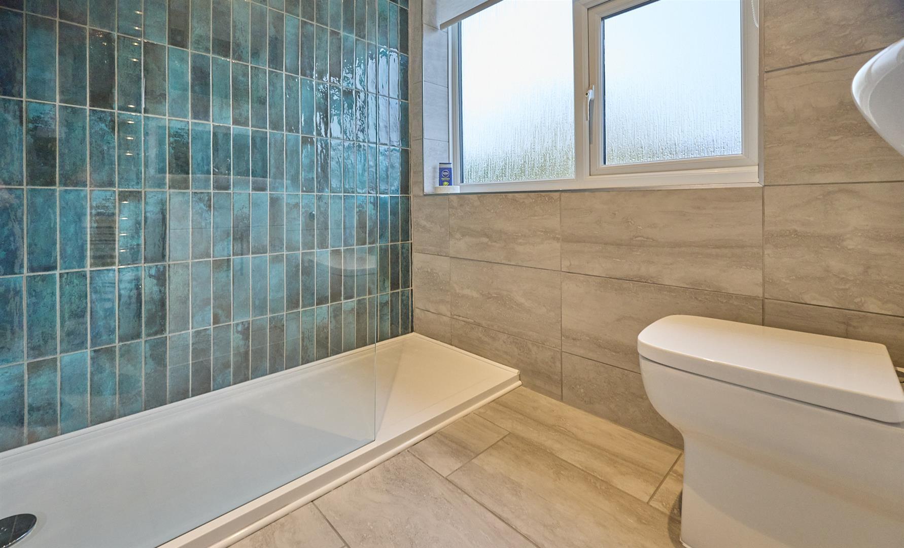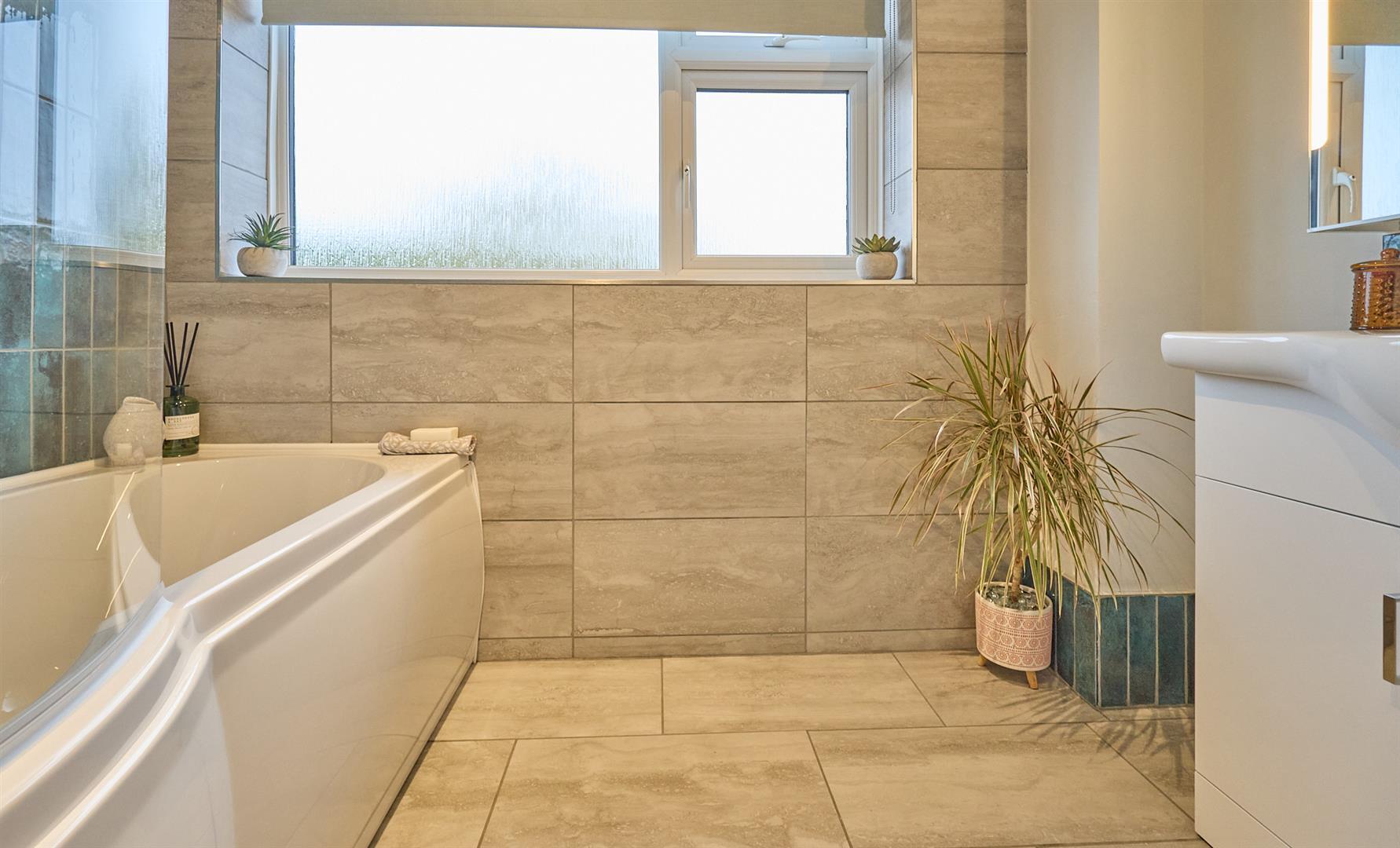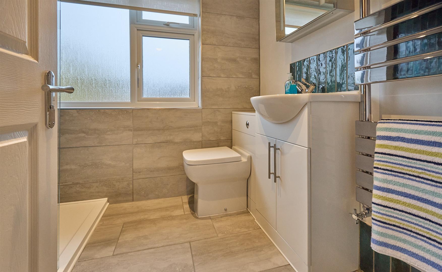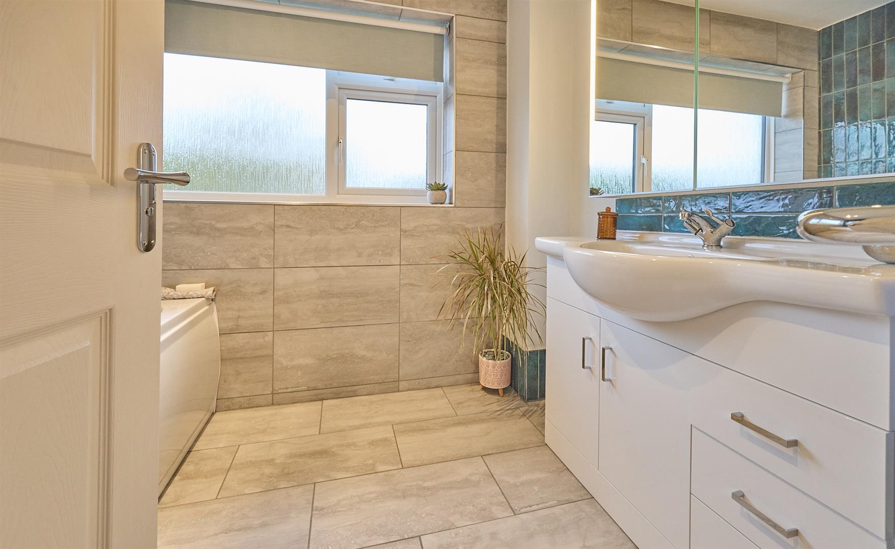 With fully tiled walk in double shower with glazed shower door, hand held and rain shower above, vanity sink unit with gloss white cupboard beneath, illuminated mirror fronted and heated bathroom cabinet above, low level WC, contrasting tile and porcelain surrounds including the flooring, chrome heated towel rail, inset ceiling spot light, extractor fan.