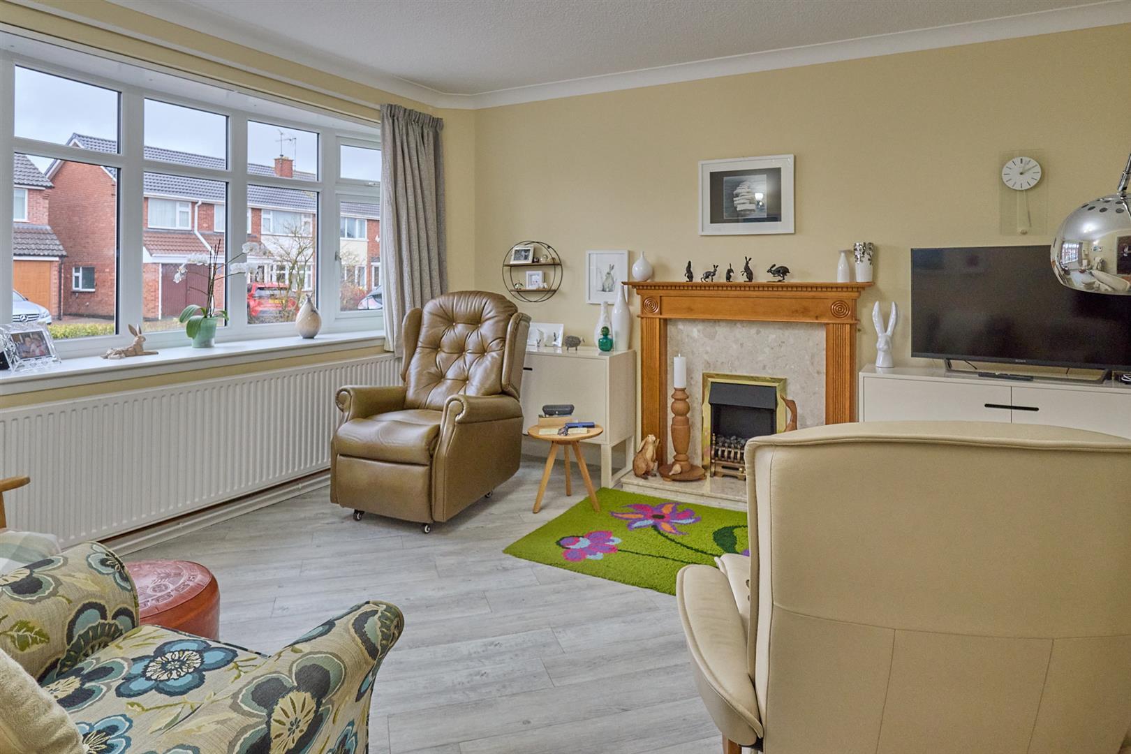 With feature fire place having ornamental wood surrounds, raised marble hearth and back incorporating living flame coal effect gas fire, grey wood oak laminate flooring, radiator, coving to ceiling, TV aerial point, UPVC SUDG bay window to front. White six panel double doors lead to