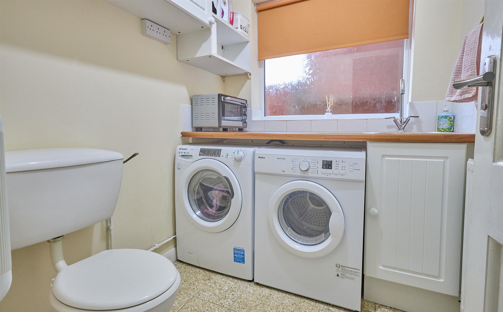 With a range of white fitted units consisting inset circular stainless steel sink, mixer taps above, cupboard beneath, surrounding wood grain roll edge working surfaces, tiled splashbacks. Further wall mounted cupboard units and shelving, appliance recess points, plumbing for automatic washing machine there is also a vent for a tumble dryer. Low level WC, radiator, Terrazzo tile flooring, door to