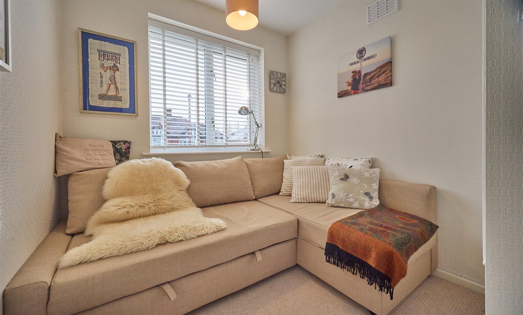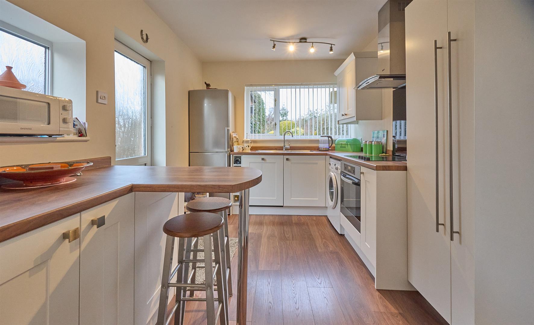 With a fashionable range of matt white fitted kitchen units with soft closed doors consisting inset single drainer stainless sink unit, cupboard beneath, further matching range of floor mounted cupboard units, contrasting walnut finished roll edge working surfaces above with inset four ring Zanussi induction hob unit, single Zanussi fan assisted oven with grill beneath. Zanussi stainless steel chimney extractor above. Matching upstands further matching range of wall mounted cupboard units, there is also one double larder cupboard., matching breakfast bar. Appliance recess points, plumbing for automatic washing machine. (The white goods are included). Radiator, luxury vinyl tile flooring, UPVC SUDG door to the side of the property.