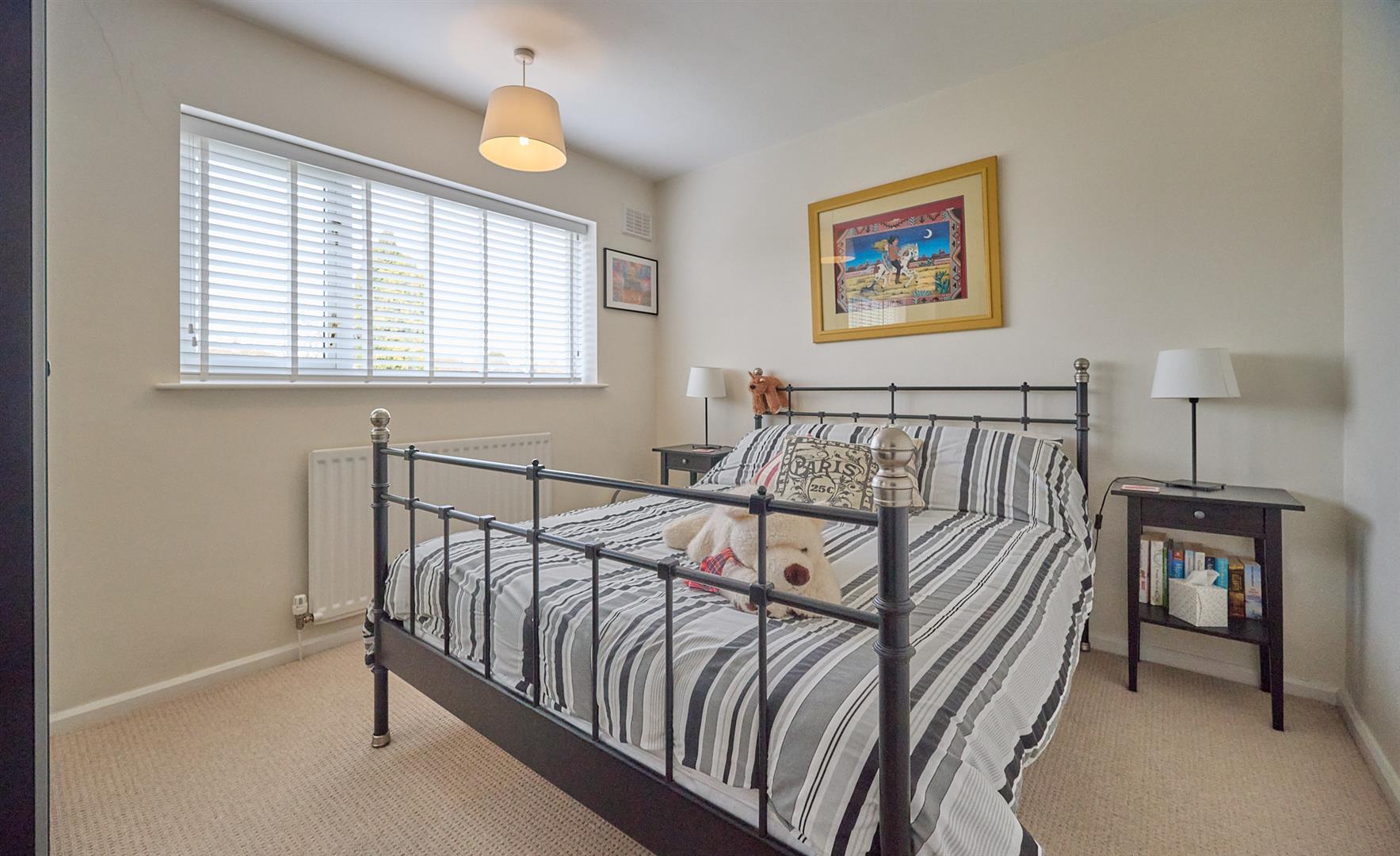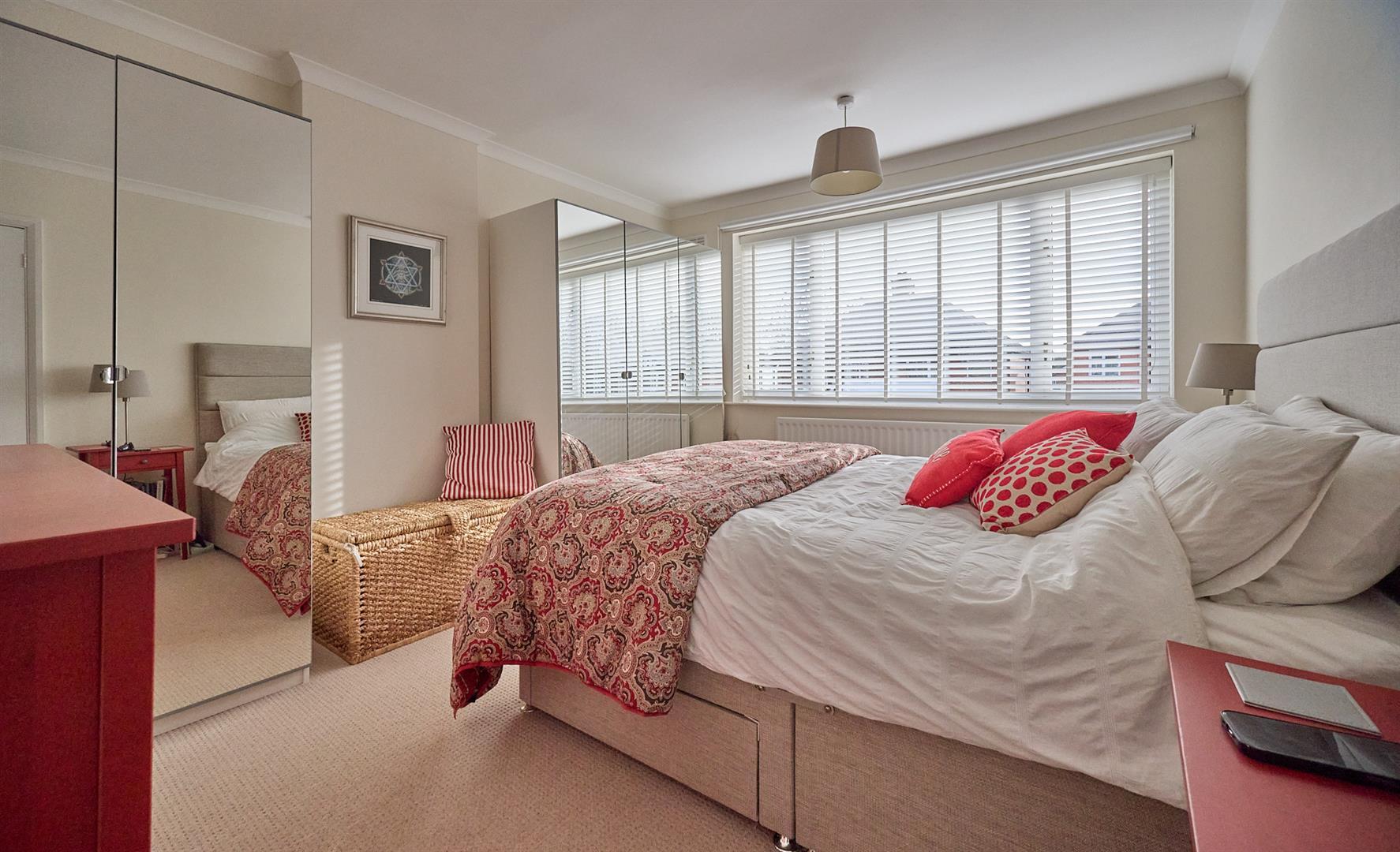 With radiator, range of bedroom furniture with mirror glazed doors to front consisting two double wardrobes and one single wardrobe unit, coving to ceiling.