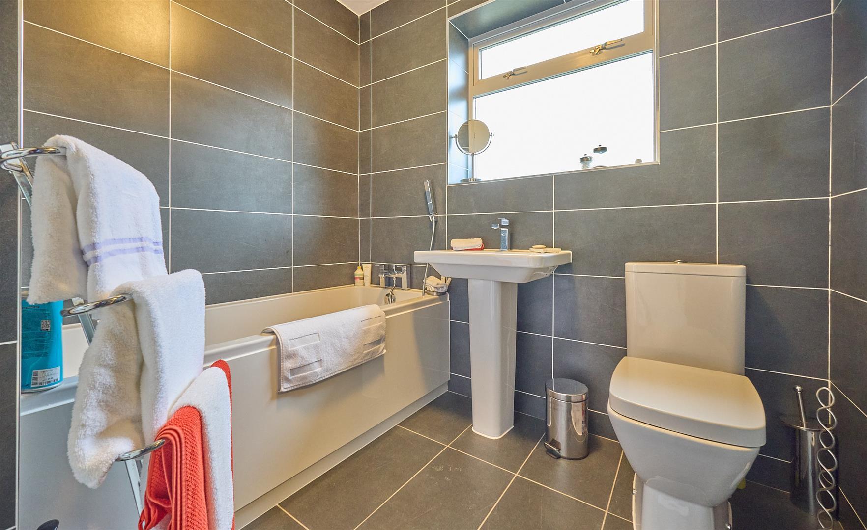 With white suite consisting panel bath, mixer tap and hand held shower unit above, pedestal wash hand basin, low level WC, contrasting tiled surrounds including the flooring, chrome heated towel rail, wall mounted illuminated mirror above the chrome heated towel rail, shaver point.
