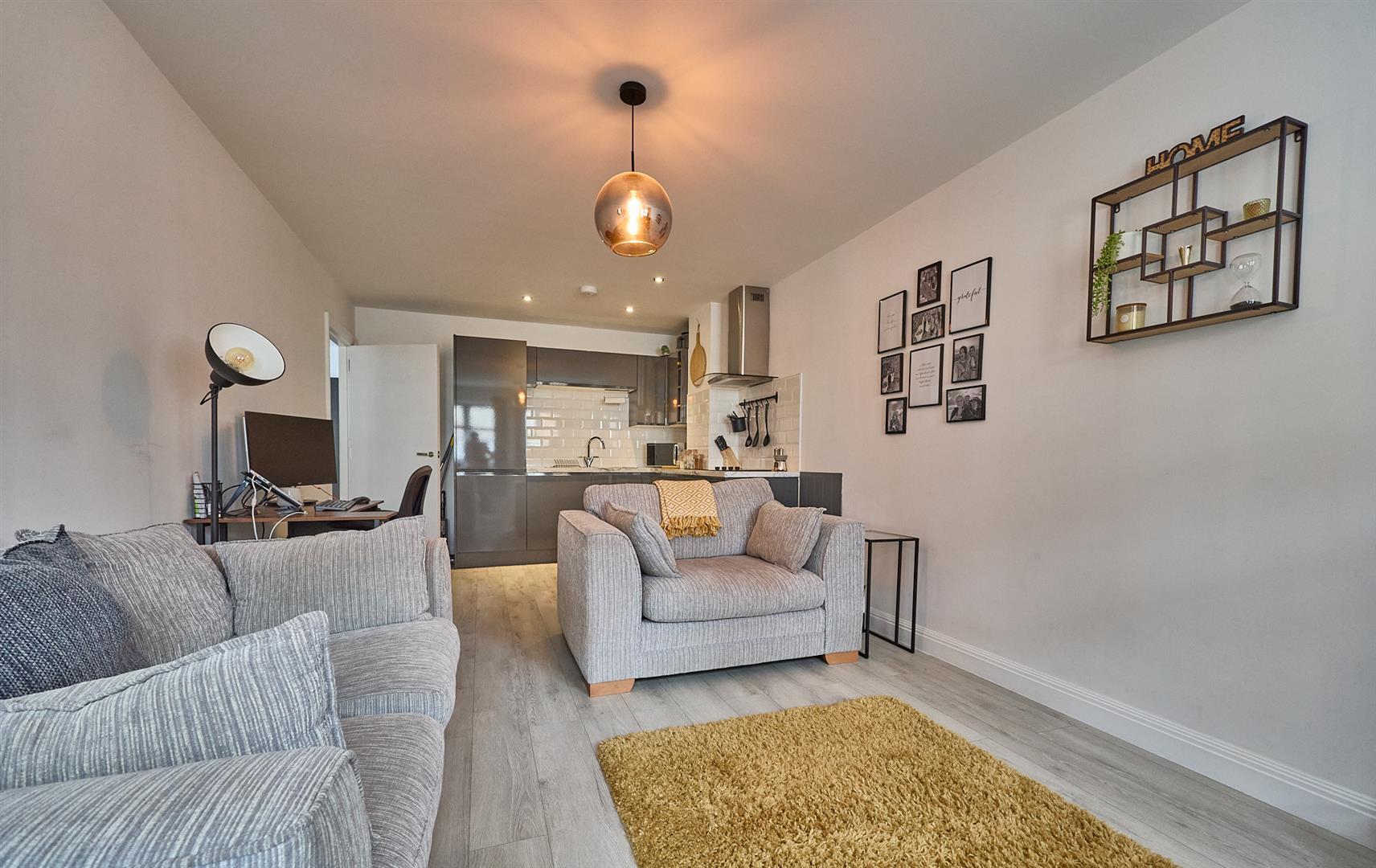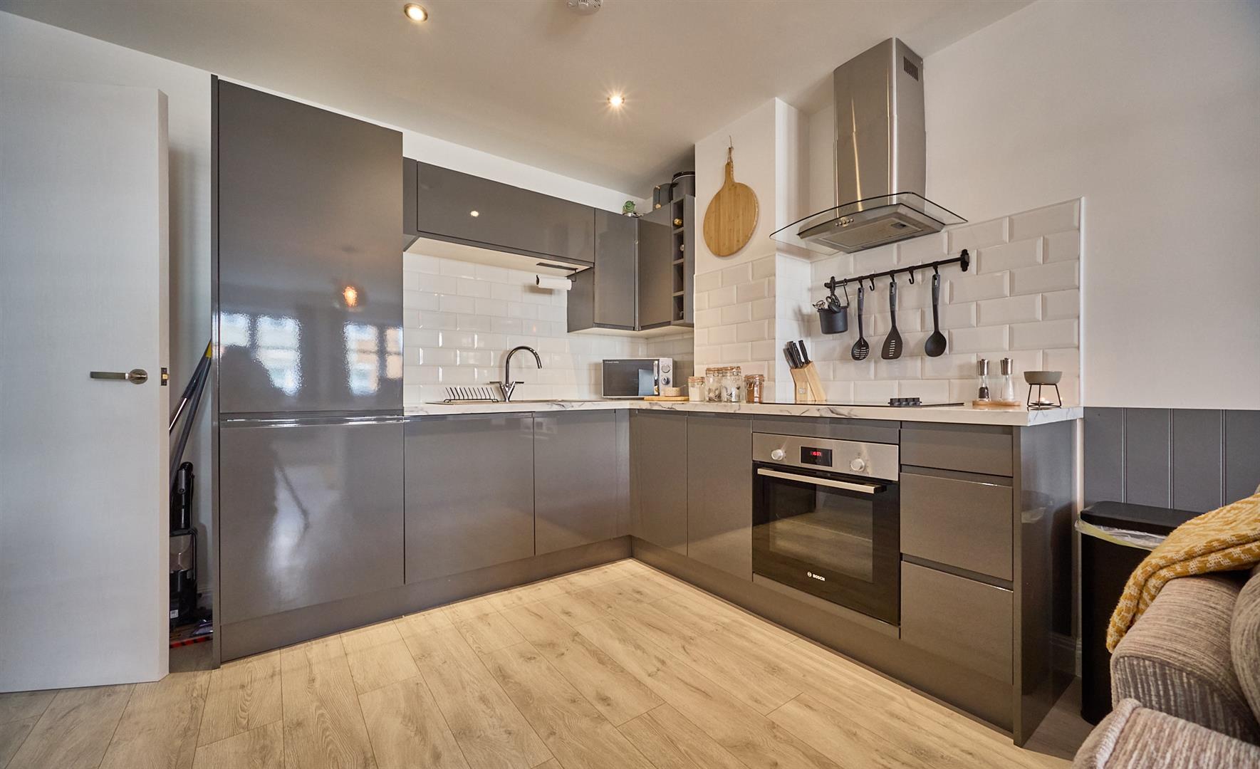 With a fashionable range of gloss grey fitted kitchen units with soft close doors consisting inset single drainer stainless steel sink unit, mixer taps above double base unit beneath. Further matching range of floor mounted cupboard units and three drawer unit. Contrasting white marble finish working surfaces above with inset four ring induction hob unit, single fan assisted oven with grill beneath. Stainless steel chimney extractor hood above. White tiled splashbacks. Further matching range of wall mounted cupboard units and shelving. Further integrated appliances include a washer/dryer and a fridge freezer. There is also inset ceiling spotlights. Wired in heat detector. Grey oak laminate wood strip flooring.
