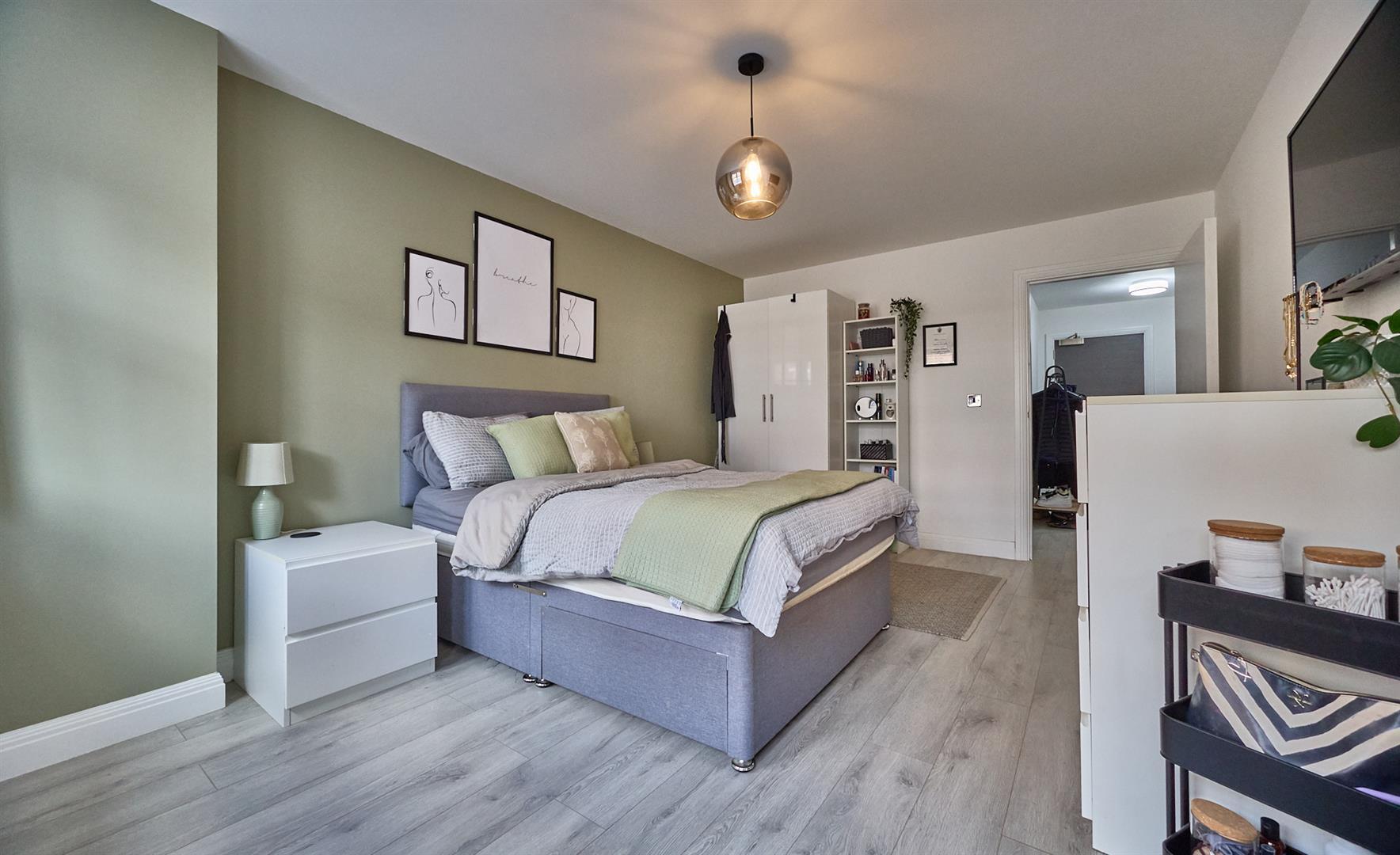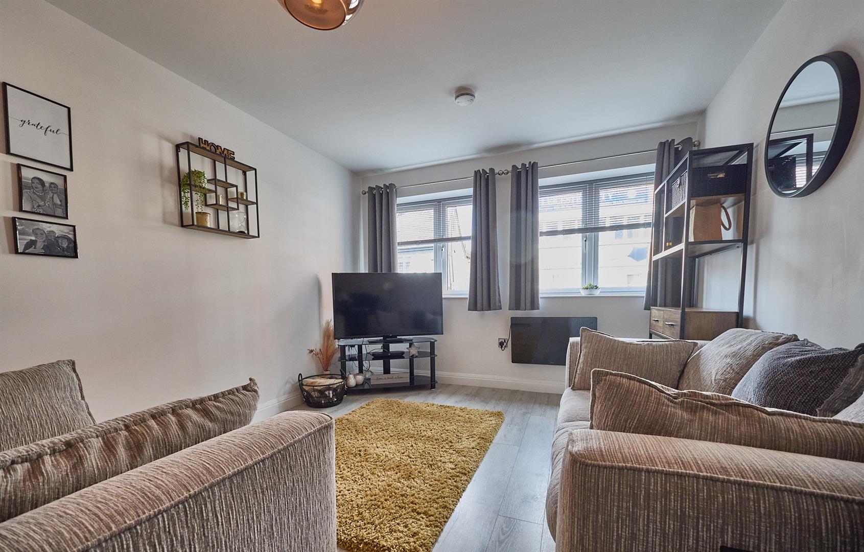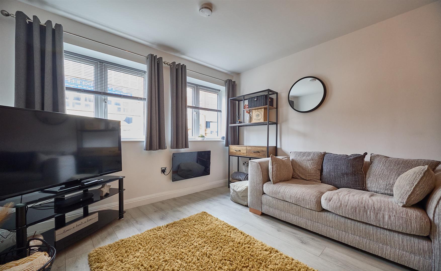 With grey oak laminate wood strip flooring, TV aerial point and wired in smoke alarm, wall mounted wireless controllable electric heater.