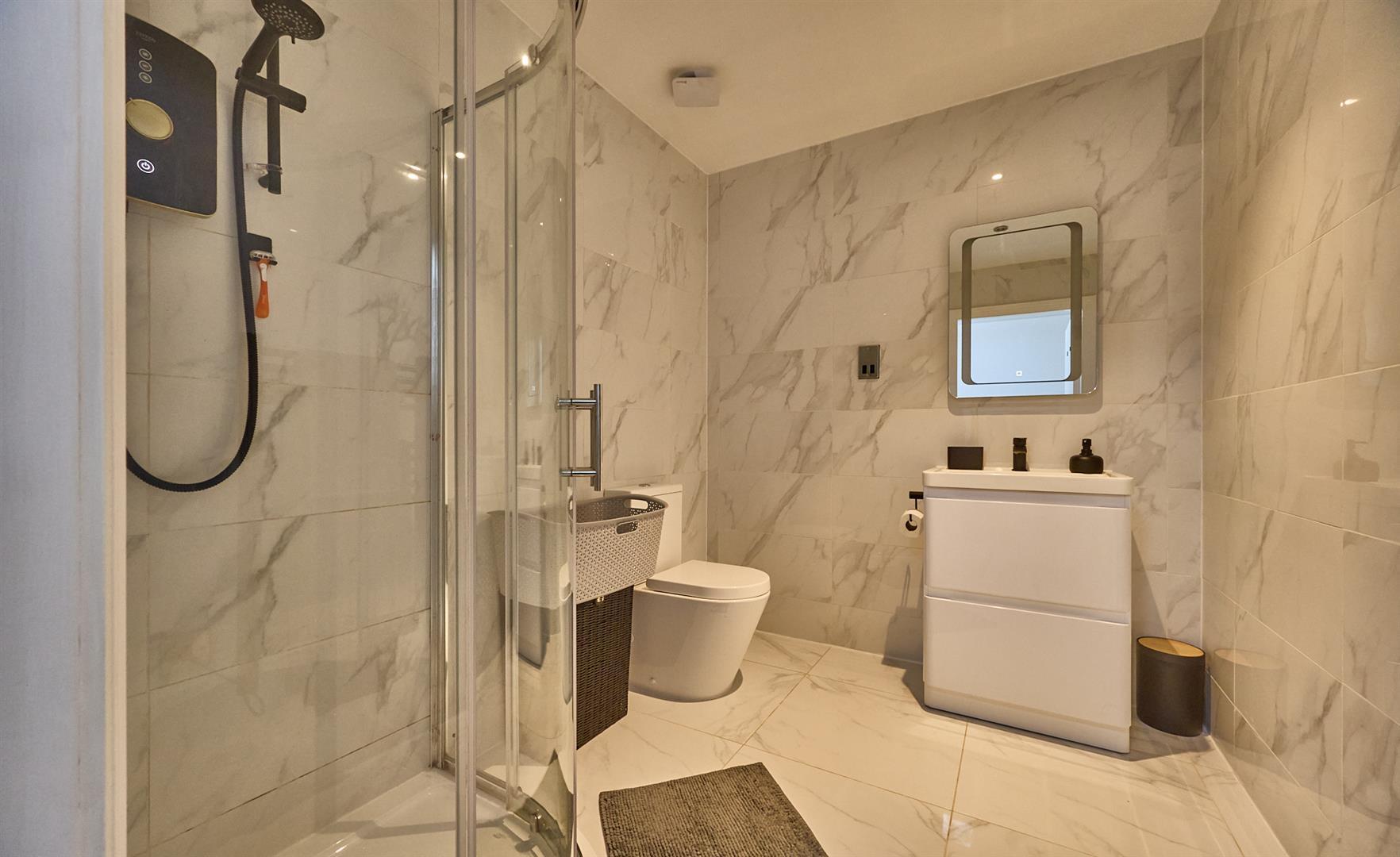 With white suite consisting of a fully tiled corner shower cubicle with glazed shower doors, vanity sink unit with gloss white drawers beneath, illuminated mirror above. Low level WC. Contrasting fully tiled including the flooring. Shaver point and inset ceiling spotlights. Extractor fan, wall mounted black heated towel rail.