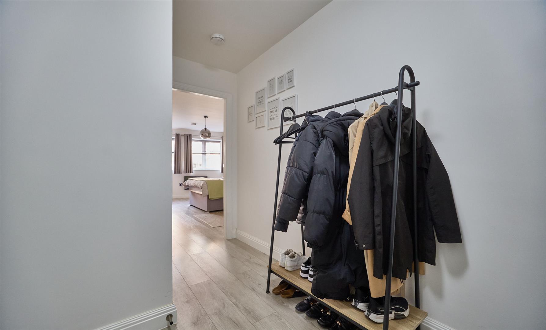With grey oak wood finish laminate wood strip flooring, security entry phone, telephone points including broadband. Wall mounted consumer unit, wired in smoke alarm. All power points and light switches are in chrome. Attractive white woodgrain interior doors to