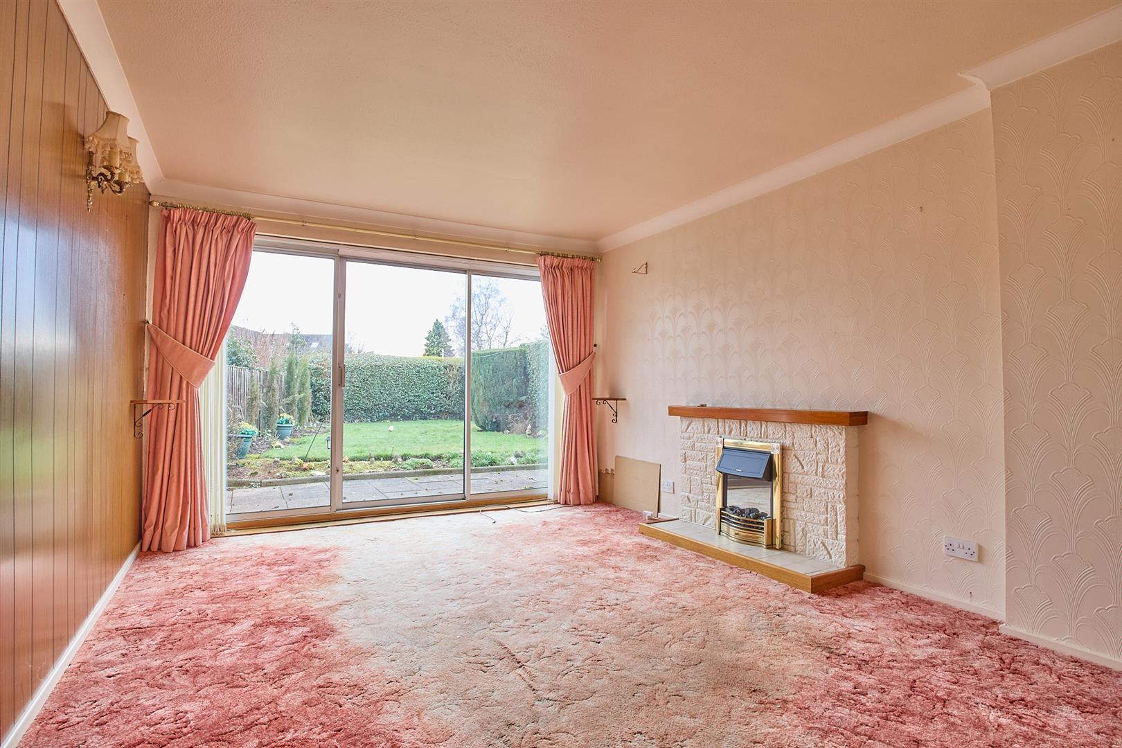 With double panel radiator, aluminium sliding doors to rear garden, feature fireplace with timber mantle brick backing and tiled hearth incorporating an electric fire.