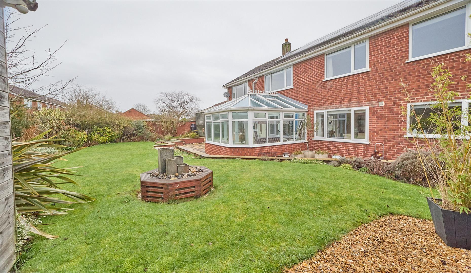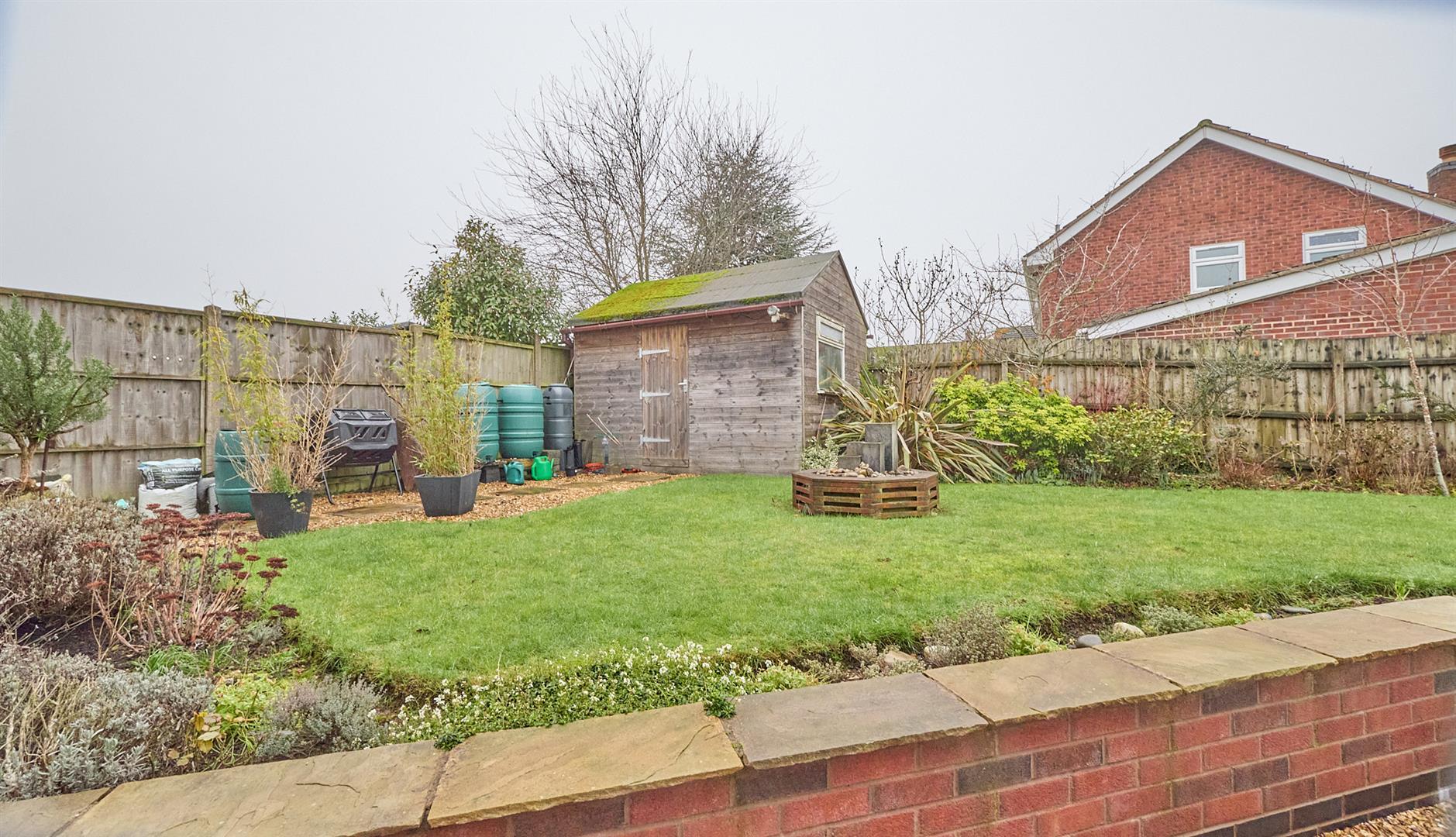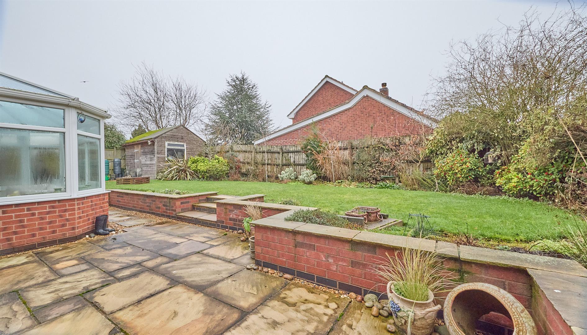 A UPVC SUDG door, from the driveway, and covered side entry offer access to the fully fenced and enclosed rear garden with a slabbed and stoned patio adjacent to the full length of the property, with outside tap, beyond which the garden is principally laid to lawn, edged by a brick retaining wall and having surrounding borders. There is a well established pond which is surrounded by a brick retaining wall and a large insulated timber shed to the top of the garden which has light and power. There are also solar panels (owned) and these offer a feed in tariff income of approximately £2500 per year.