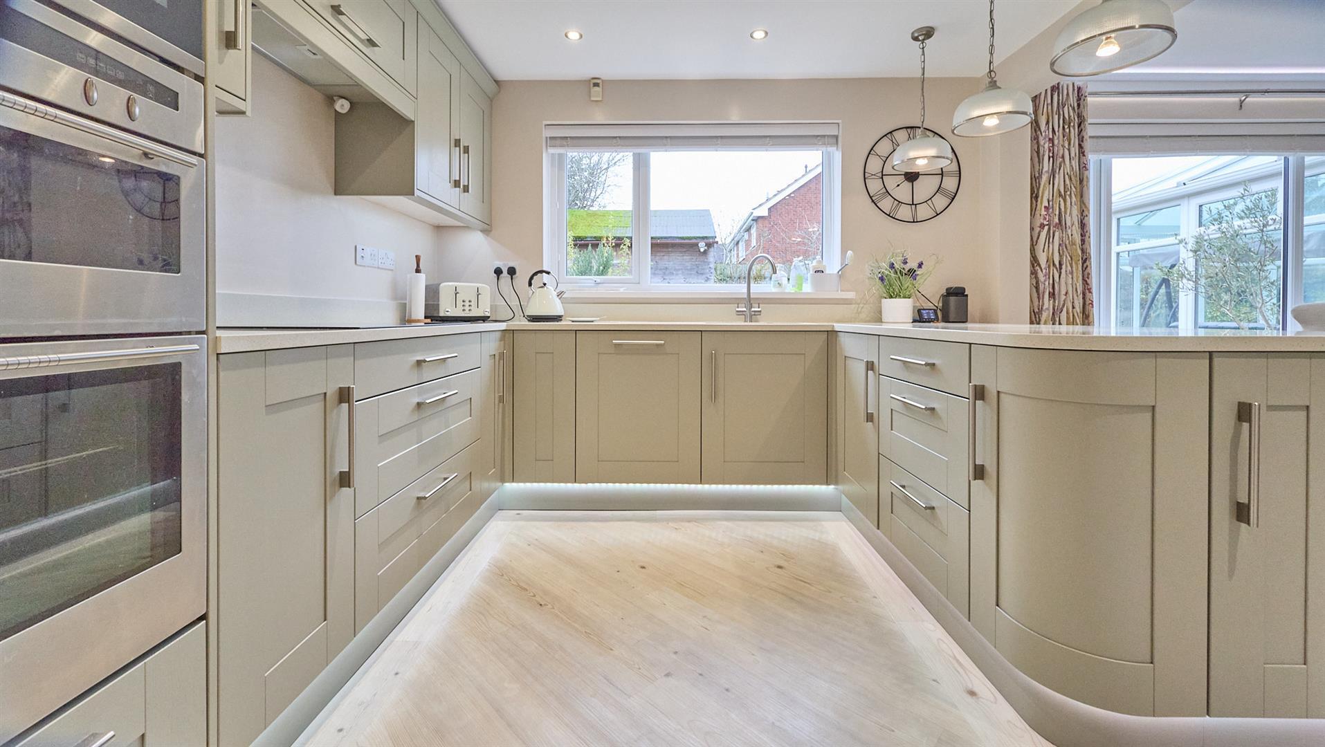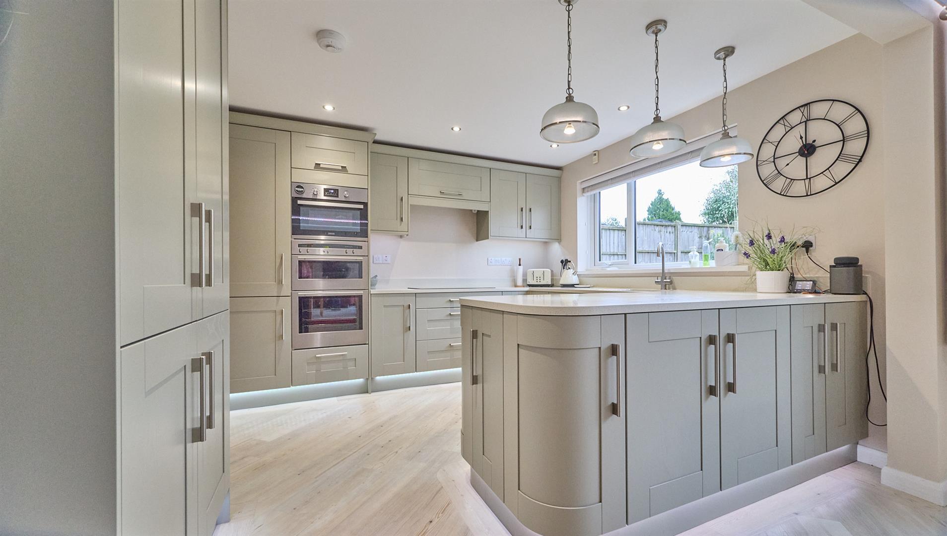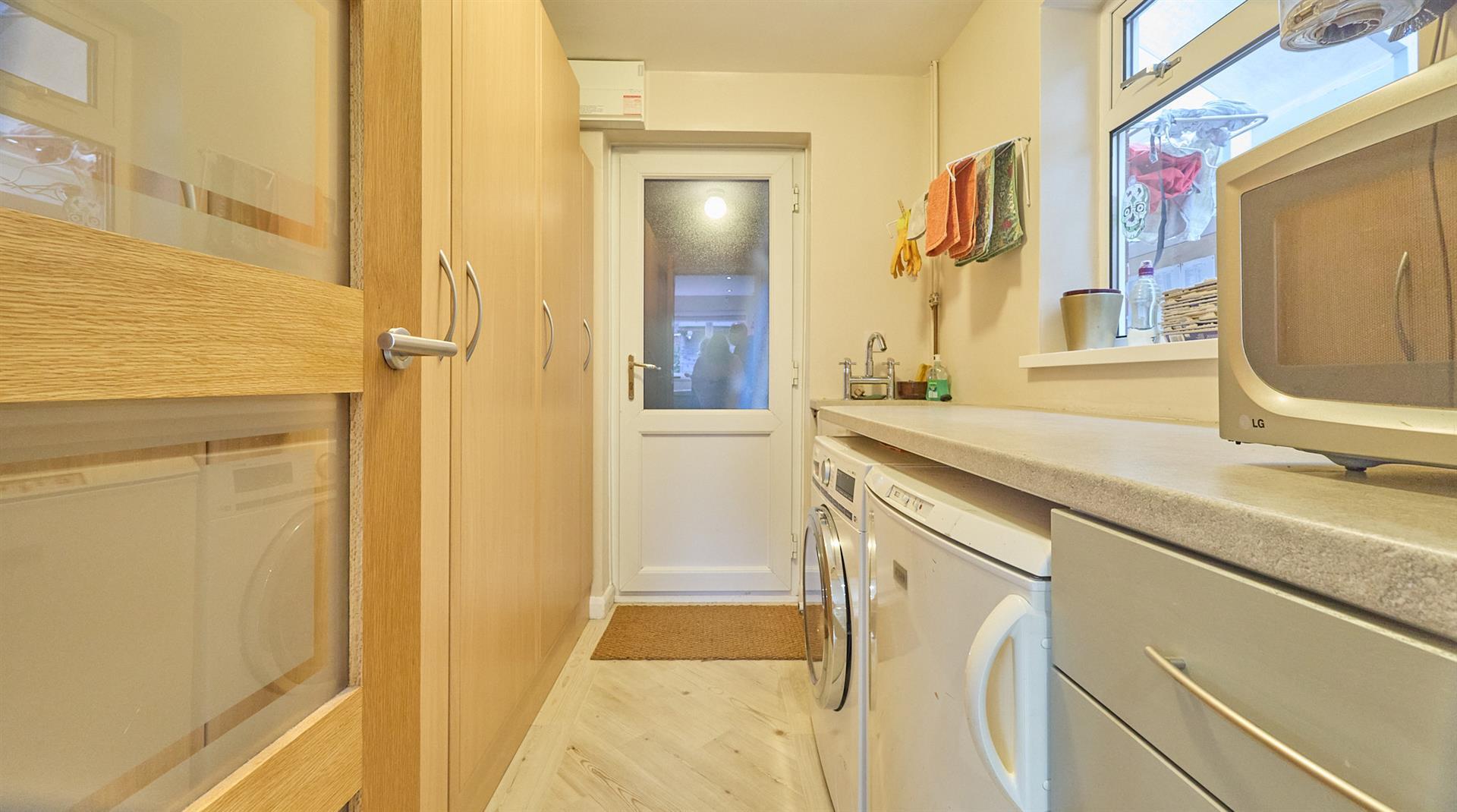 With a range of sage green fitted kitchen units with one and a half bowl stainless steel drainer sink with mixer tap and manmade composite Slab Tech working surfaces above in Crushed Cotton. Integrated appliances include a fridge freezer, double oven and a further microwave oven, dishwasher and a further range of matching wall mounted units, Zanussi four ring induction hob with extractor above. A further range of matching wall mounted cupboard units and a full height larder cupboard unit. Appliance recess points, concealed floor lighting, Karndean flooring, inset ceiling spotlights and vertical radiator. Wooden and glazed interior door to the utility room.