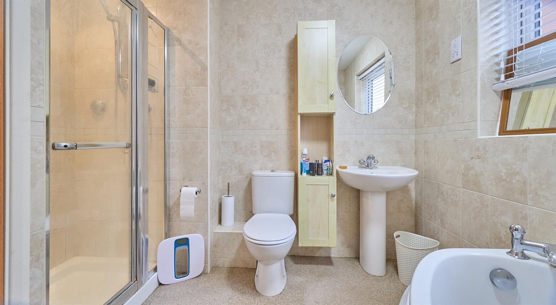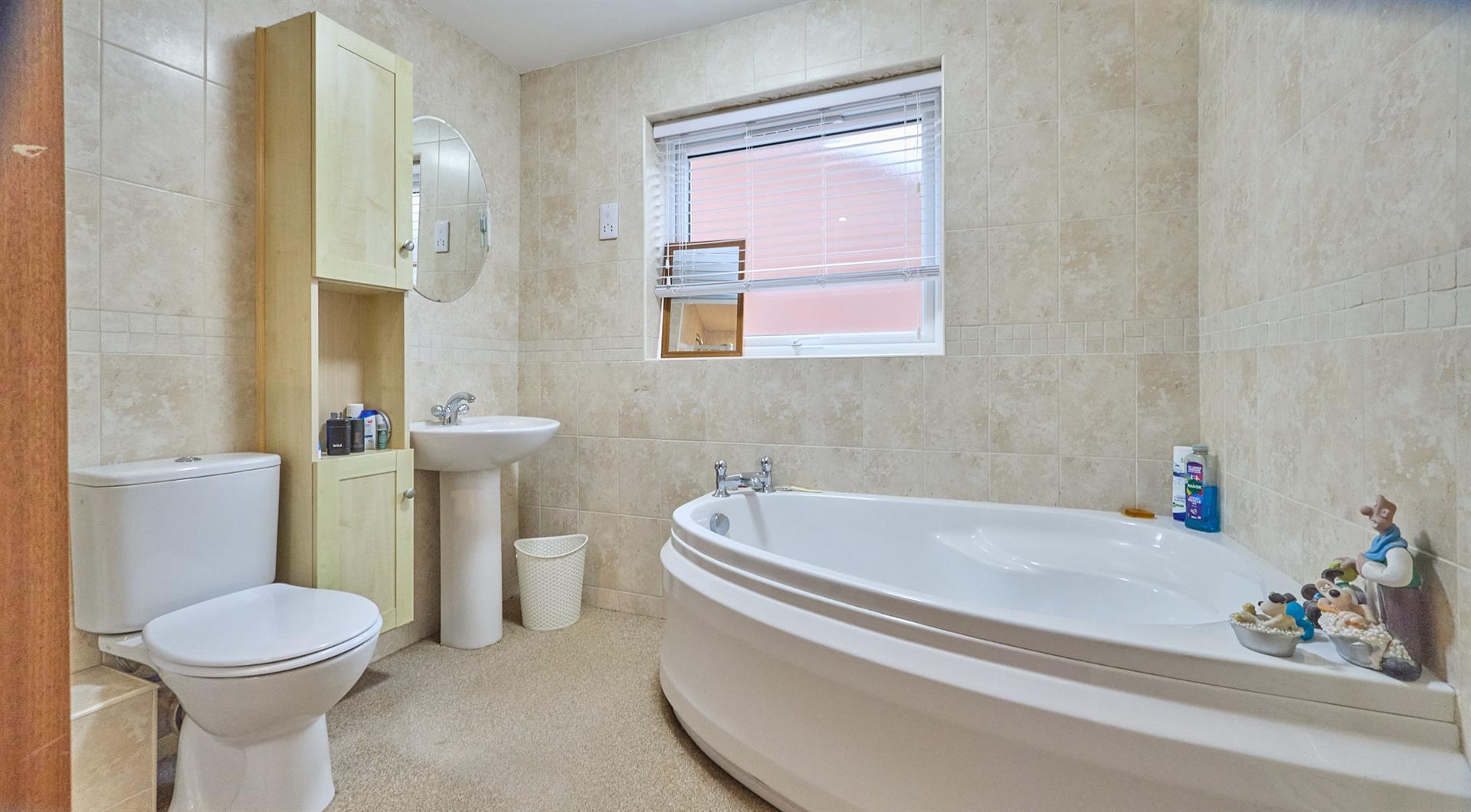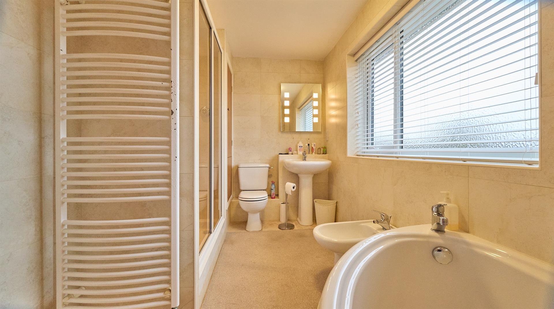 With a four piece suite consisting of a corner panelled bath with mixer tap, shower cubicle with fully tiled surrounds with shower attachment and shower door., low level WC and pedestal wash hand basin. Fully tiled surrounds, shaver point and heated towel rail.