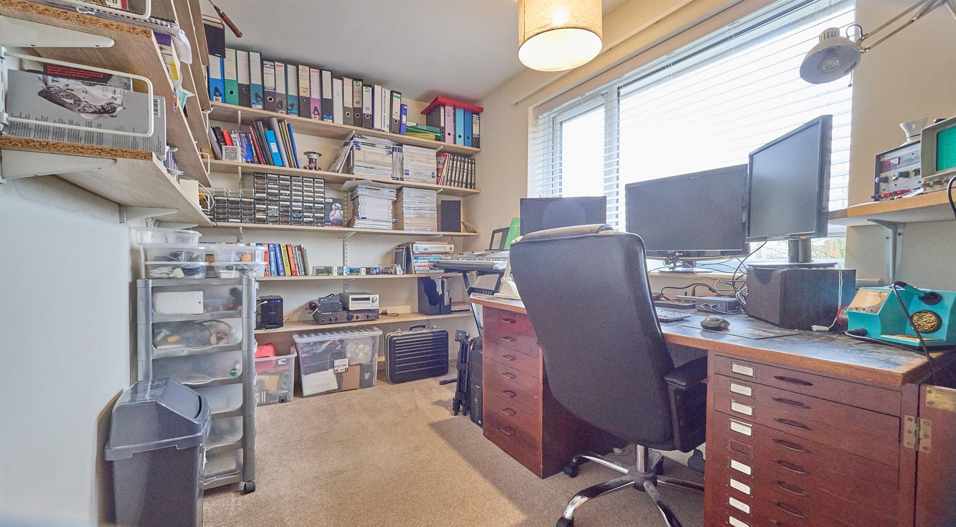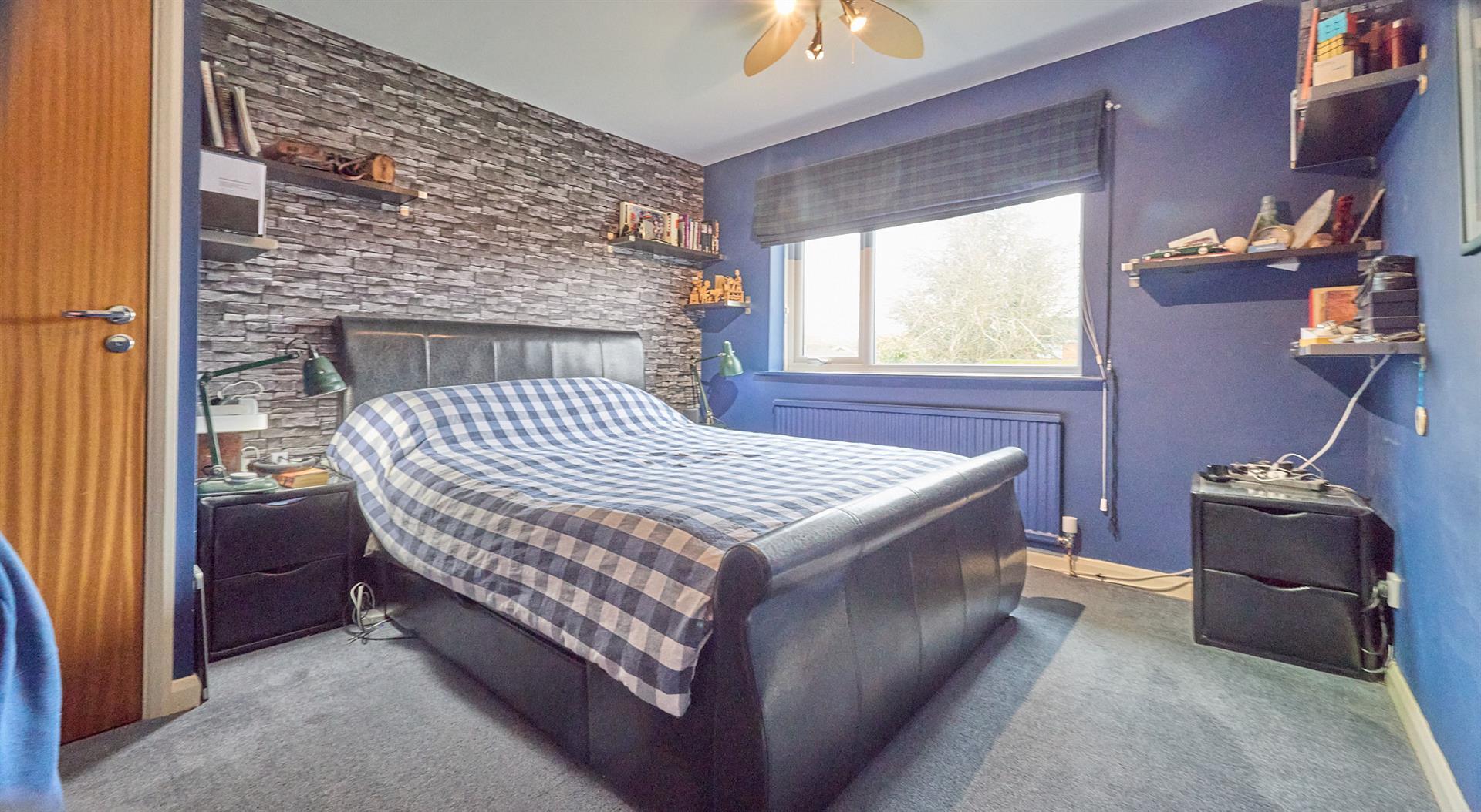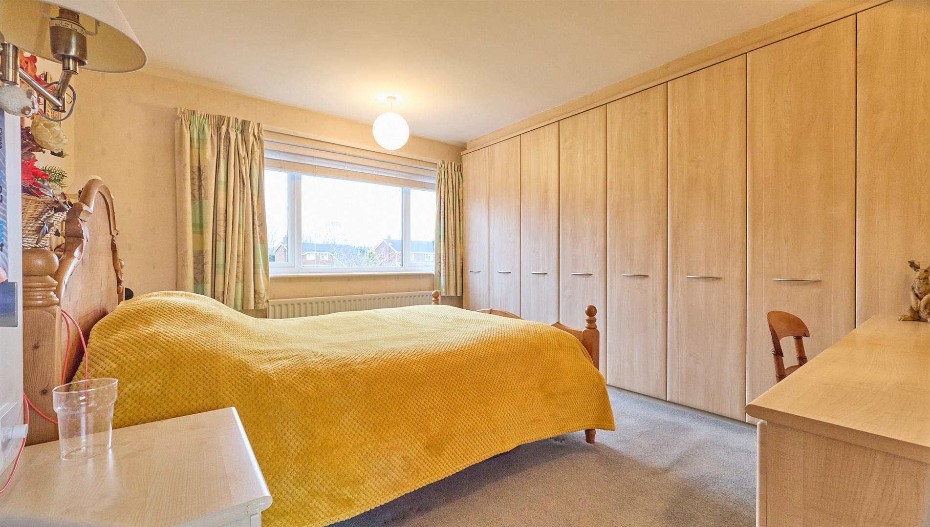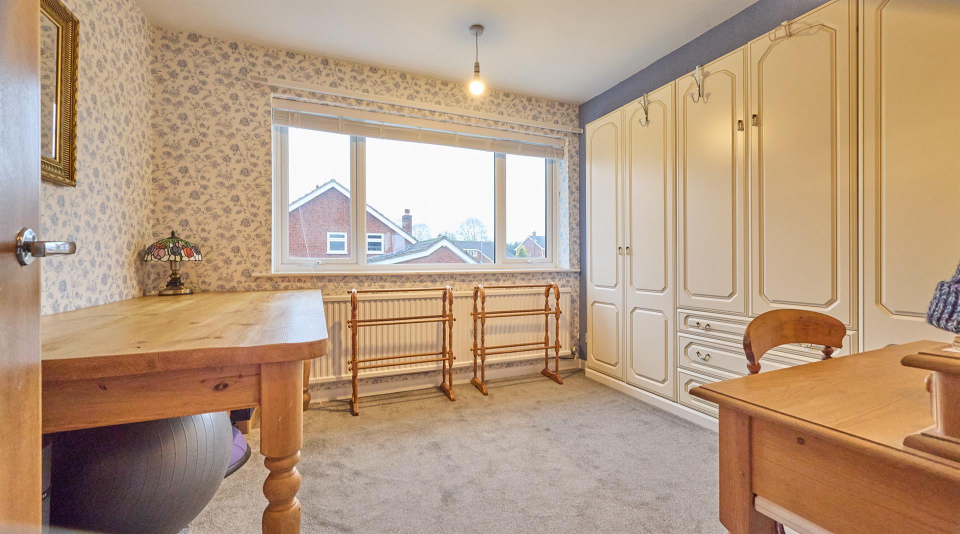 With a range of Hammonds built in bedroom furniture consisting of three double and one single full height wardrobe units, matching dressing table with seven drawers and two matching bedside units with three drawers each. Radiator and loft access for the extension. Wooden interior door to