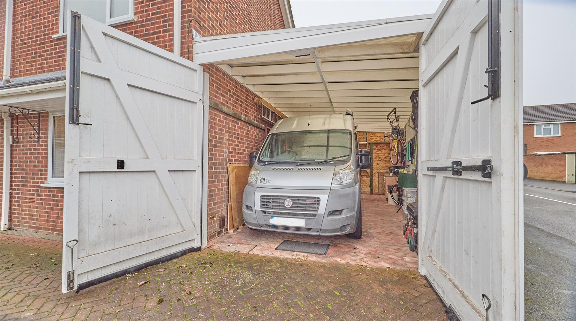 Double wooden doors offer access to a single garage (3.48m x 7.61m) with block paved flooring and pedestrian gate offering access to the rear garden. The space is large enough to house a motorhome or caravan.
