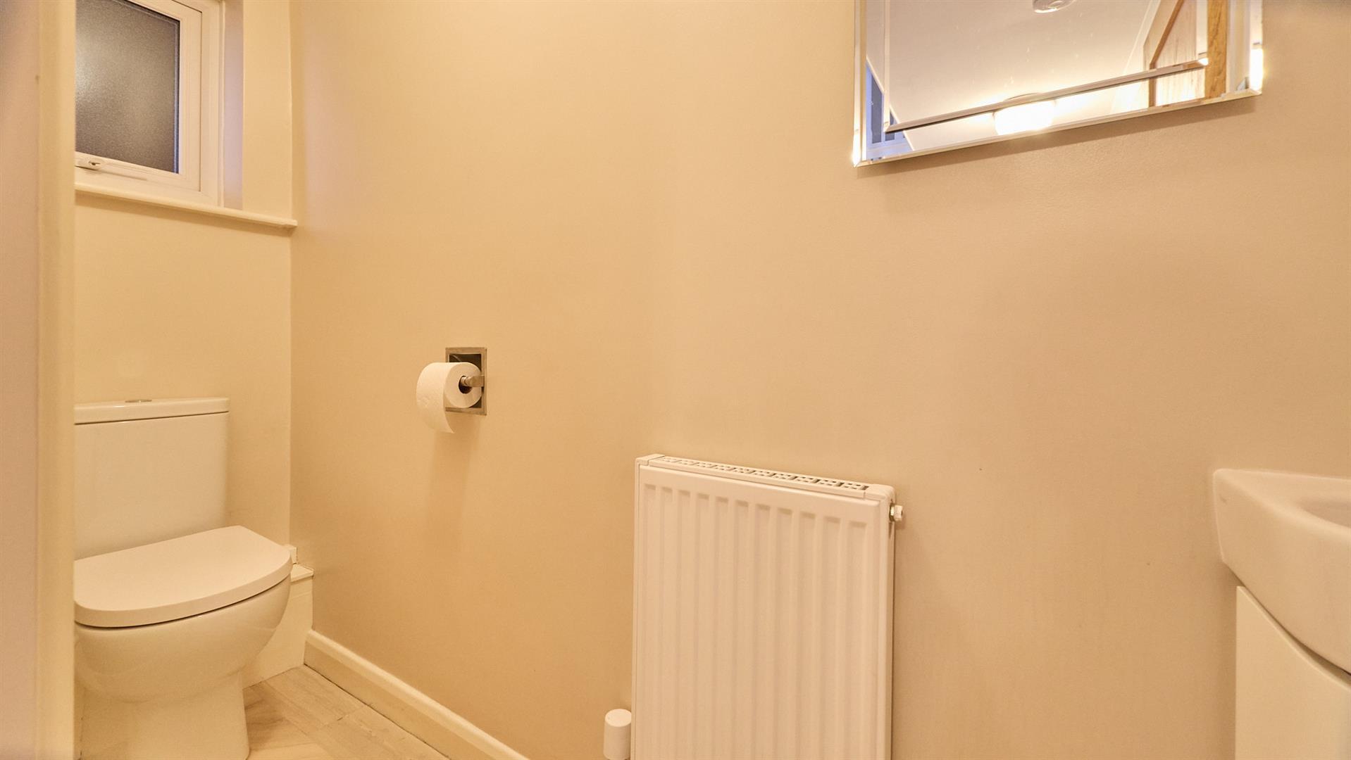 With low level WC, vanity sink unit with double cupboard beneath, radiator and Karndean flooring.