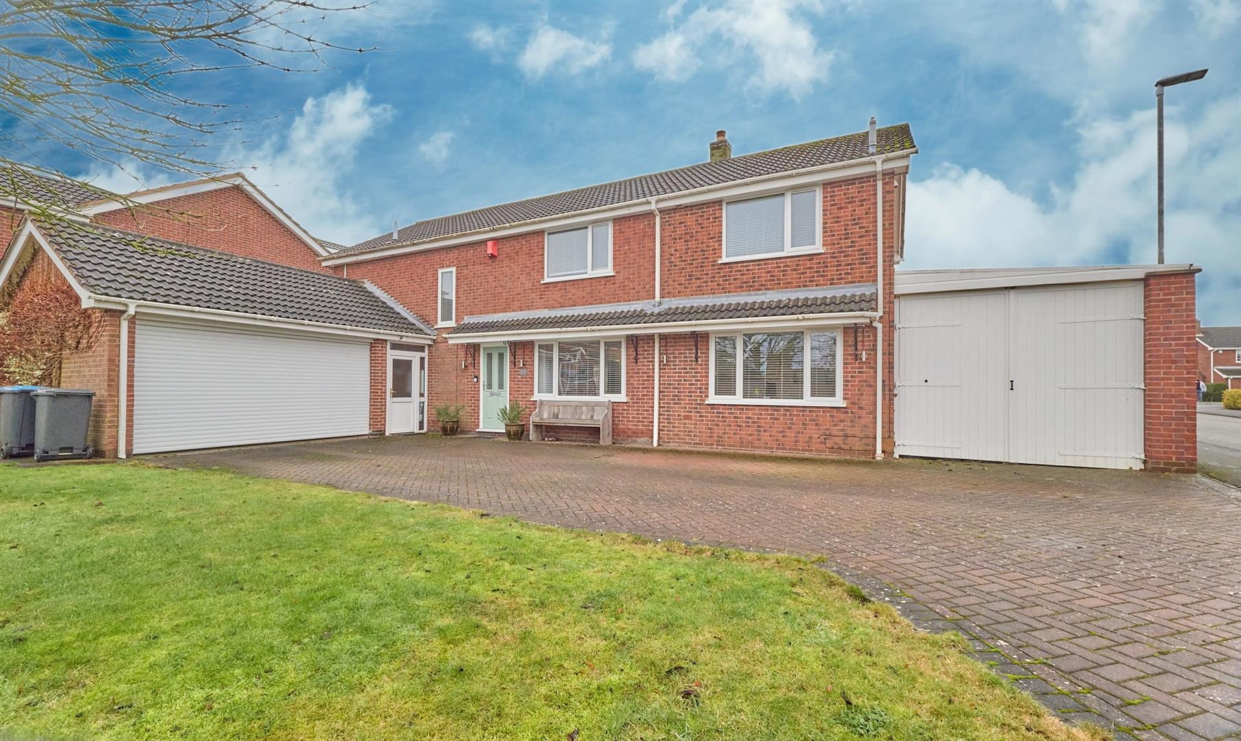 The property is nicely situated set well back from the road on an advantageous corner plot with a large block paved driveway offering ample car parking and a large lawned area to front. The driveway leads to a double garage with electric roller door to front (4.90m x 4.86) with light and power and houses the main controls for the solar panels and also has a loft offering access into the roof space where there is storage space.