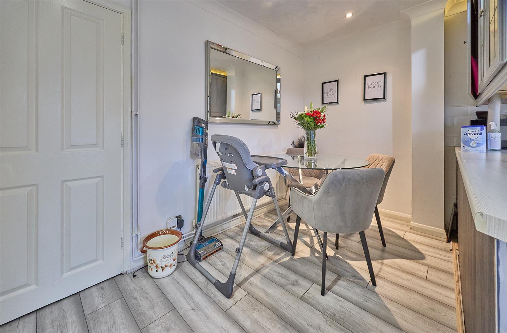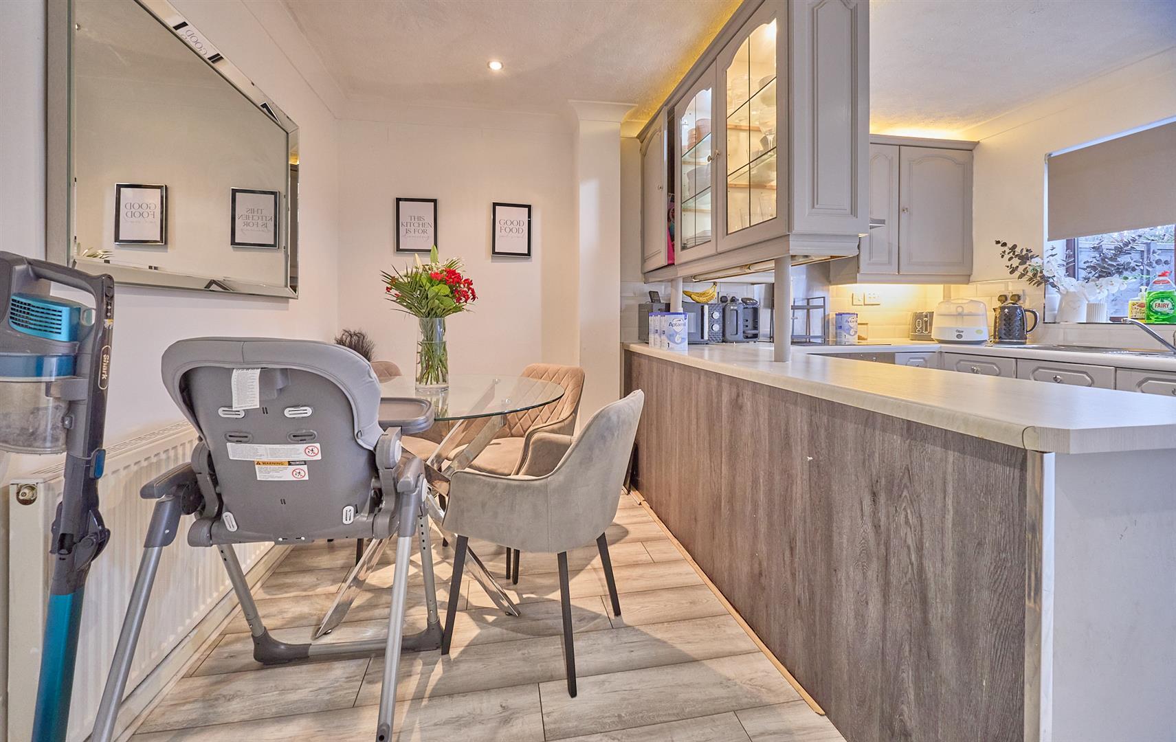 With a range of grey fitted kitchen units consisting inset one and a half bowl single drainer stainless steel sink unit, mixer tap above, double base unit beneath. Further matching range of floor mounted cupboard units and drawers, contrasting woodgrain working surfaces above with inset four ring ceramic hob unit, single oven with grill beneath. Stainless steel splashback and stainless steel extractor hood above. Tiled splashbacks, further matching range of wall mounted cupboard units including one double display unit with leaded glazed doors and concealed lighting. Appliance recess points and plumbing for automatic washing machine. Integrated larder fridge. Grey oak finish laminate wood strip flooring, radiator, inset ceiling spotlights. Coving to ceiling. Woodgrain UPVC SUDG door to the rear garden.