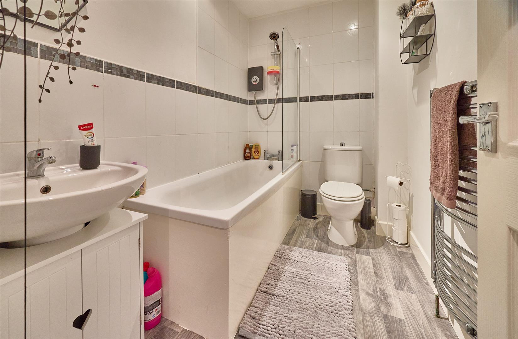 With white suite consisting panelled bath, electric shower unit above, glazed shower screen to side. Pedestal wash hand basin and low level WC, contrasting tiled surrounds, inset ceiling spotlights and extractor fan, chrome heated towel rail.