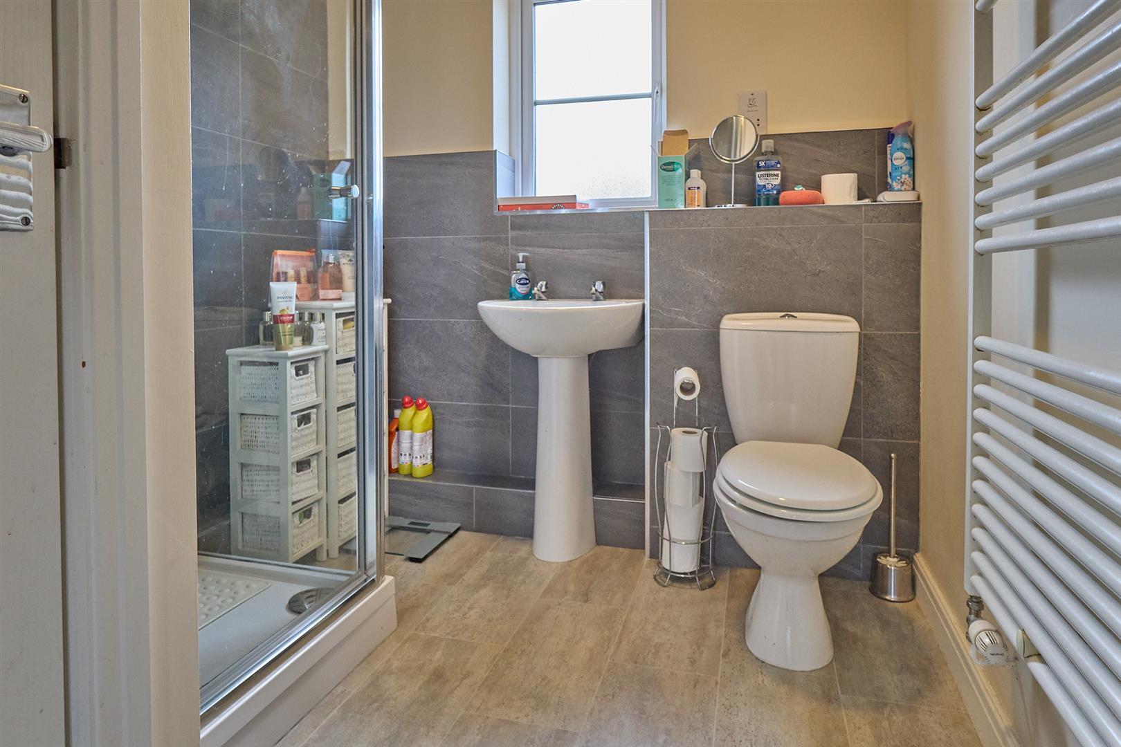 With white suite consisting of a fully tiled shower cubicle, glazed shower doors, pedestal wash hand basin, low level WC, contrasting tiled surrounds, white heated towel rail, extractor fan, shaver point, door to airing cupboard.