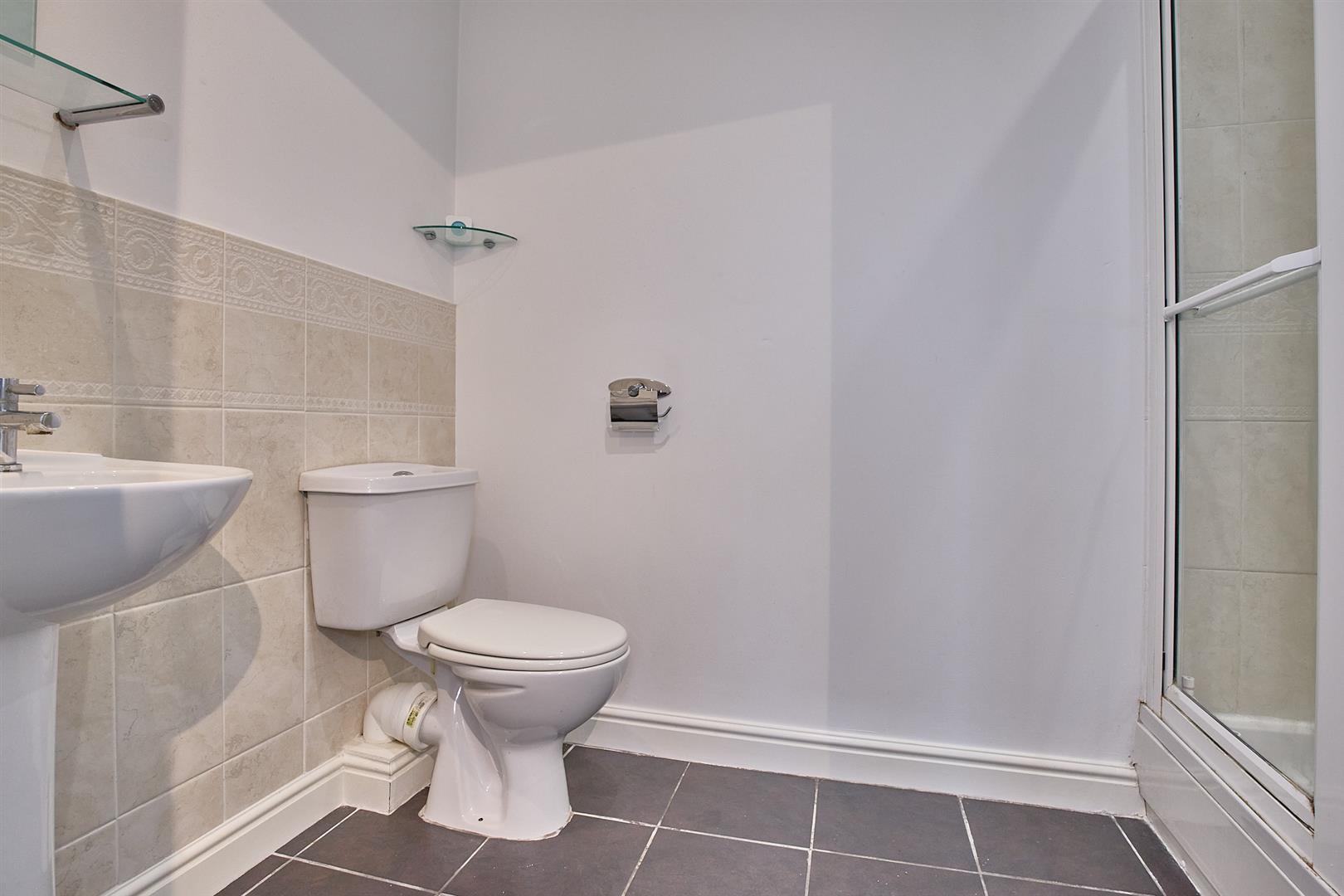 With tiled flooring, pedestal wash hand basin with chrome taps. Low level WC, shower enclosure with glazed doors, bar shower, inset ceiling spotlights and single panelled radiator, shaver point, extractor fan. panelled door to