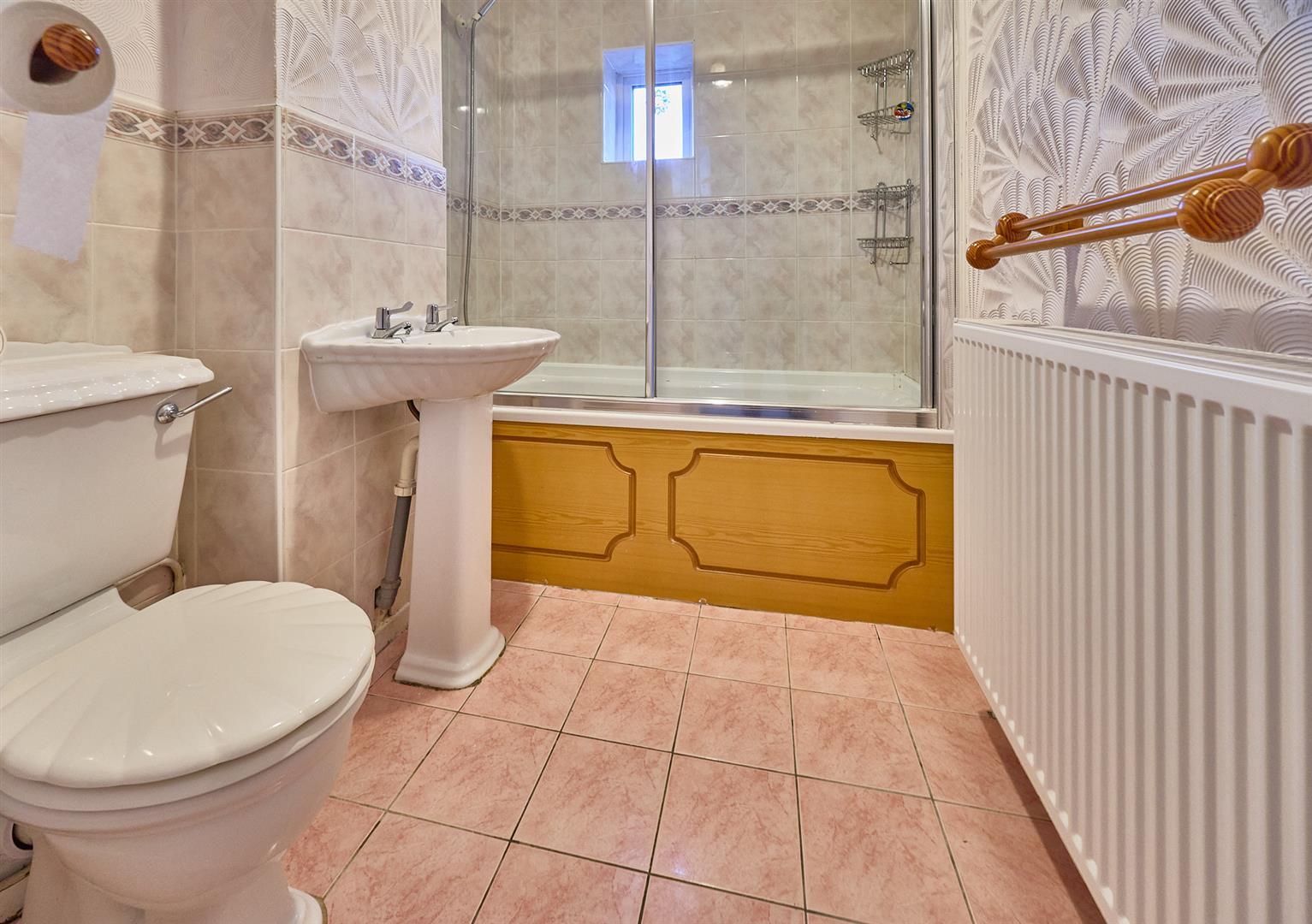 With white suite consisting panelled bath, mixer tap and shower attachment above, shower screen to side, pedestal wash hand basin and low level WC, contrasting tiled surrounds including the flooring. Radiator.