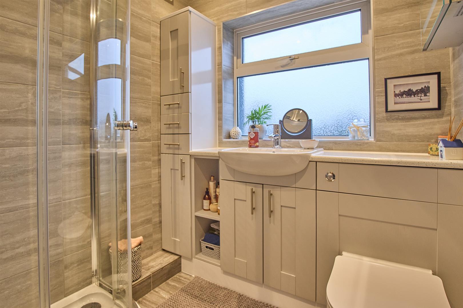 With a corner shower cubicle with shower attachment and sliding shower screen surrounding, low level WC, vanity sink unit with a double cupboard beneath. A range of fitted cupboards and drawers. Grey heated towel rail, fully tiled surrounds including the flooring. Inset ceiling spotlights and wall mounted mirror fronted illuminated cabinet and extractor fan.