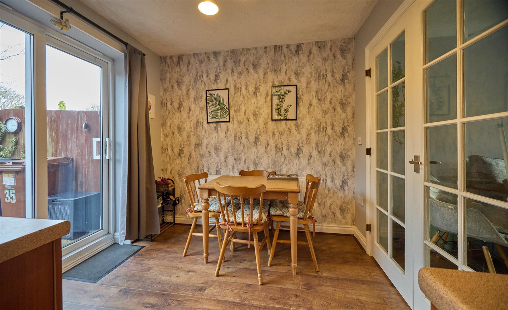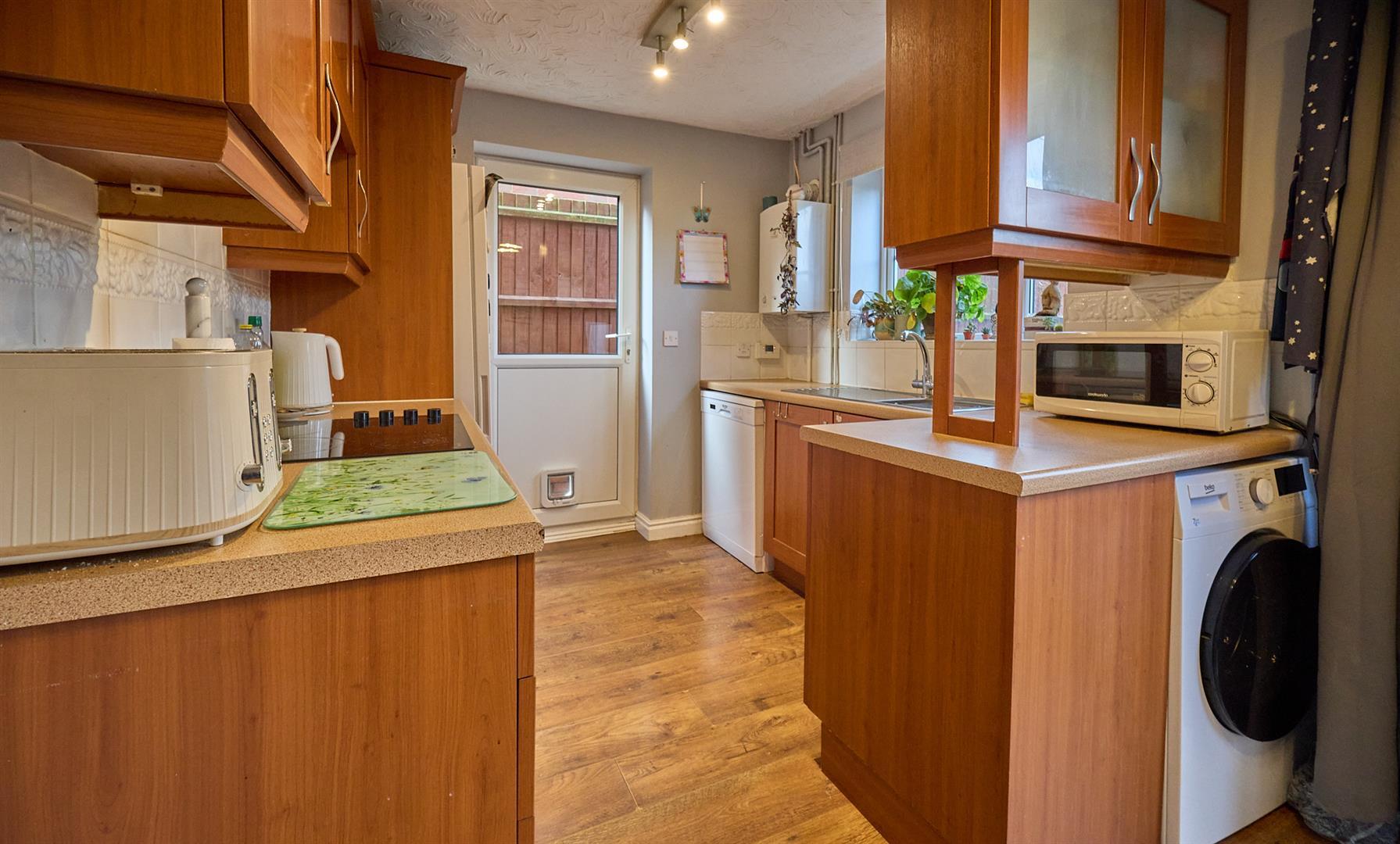 The dining area with oak stripped laminate wood flooring, radiator, UPVC SUDG sliding patio door leading to the rear garden. The kitchen with a range of maple finished fitted kitchen units consisting inset single drainer stainless steel sink, mixer tap above double base unit beneath. Further matching floor mounted cupboard units and four drawer unit, contrasting roll edge working surfaces above with inset four ring ceramic hob unit, single fan oven with grill beneath, integrated extractor above. Tiled splashbacks, further wall mounted cupboard units including one double display unit with glazed doors, appliance recess points, plumbing for dishwasher and washing machine, wall mounted Worcester gas condensing boiler for central heating and domestic hot water with digital programmer, oak finished laminate wood strip flooring, UPVC SUDG door to the side of the property.